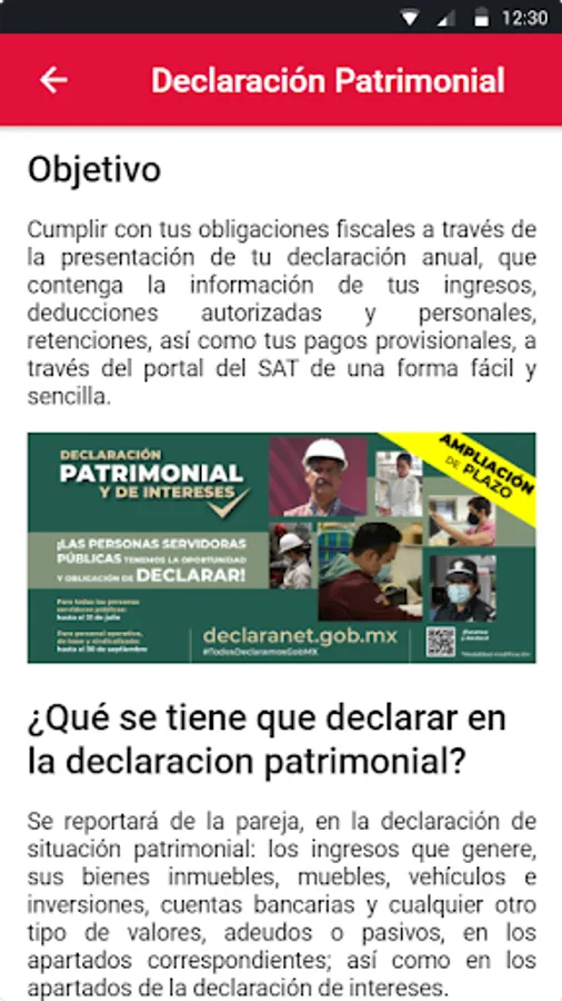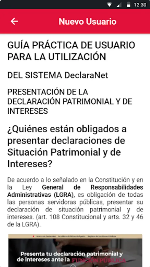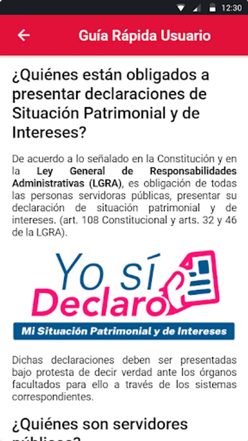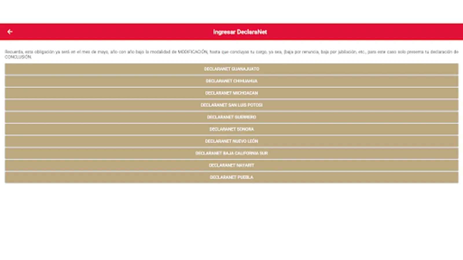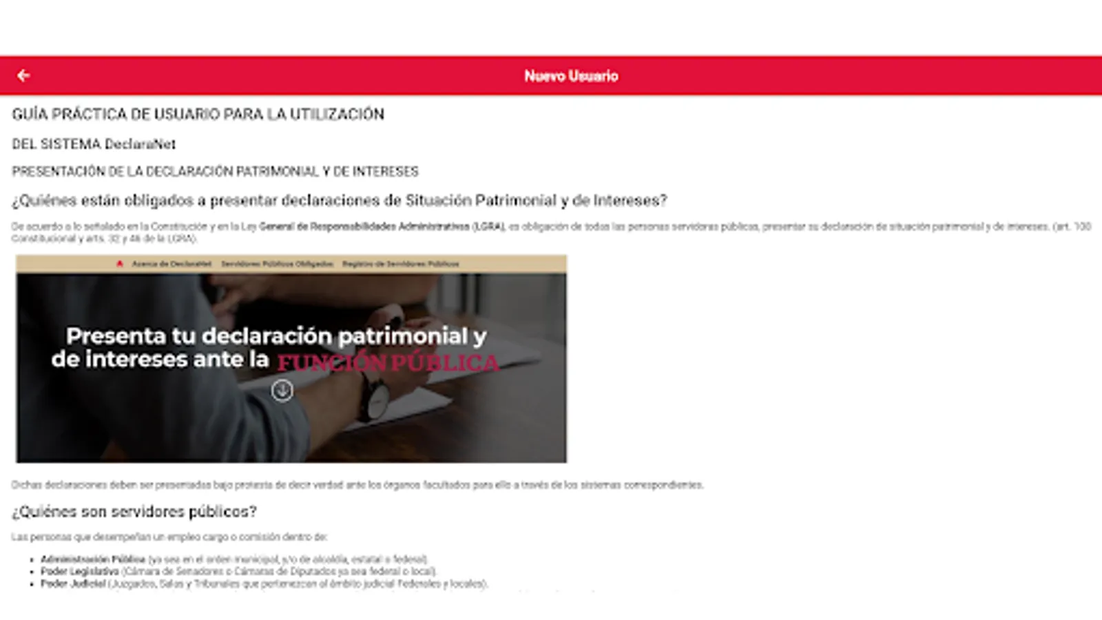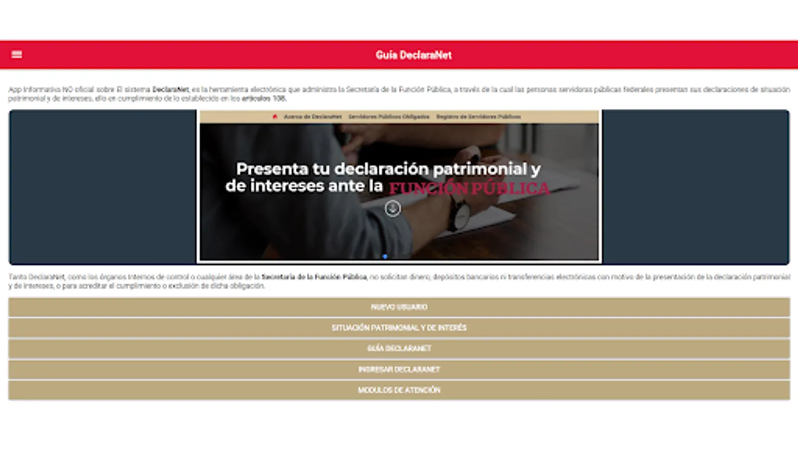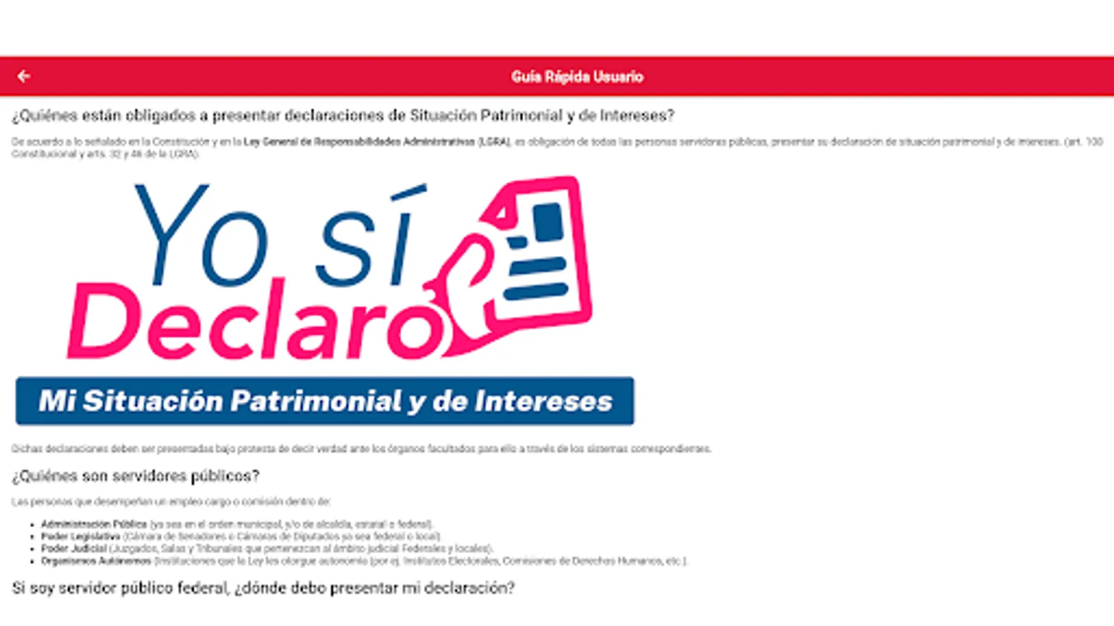 Disclaimer: Declaranet Guide is an informative application that aims to provide guidance and assistance to users in relation to declarations of assets and interests in Mexico. We want to emphasize that "Declaranet Guide" is not an official application and has no relationship with the government of Mexico, the Secretariat of Public Function (SFP) or any other government entity. All the information provided here is freely accessible at https://declaranet.gob.mx/