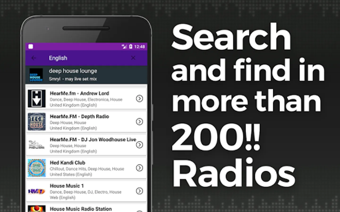 Looking for an app with all the radios of Deep House Music? Don't waste your time!! You've found the Radio App you were looking for, listen online the best radio stations of Deep House, easily and for Free