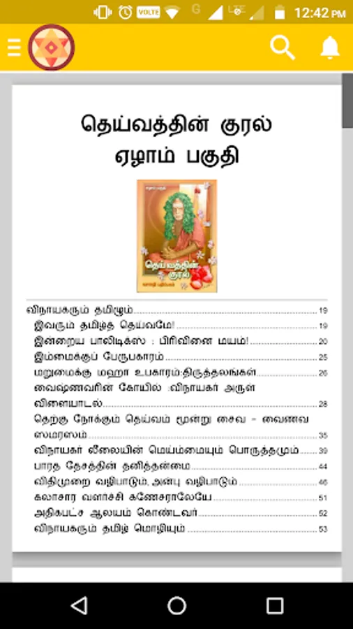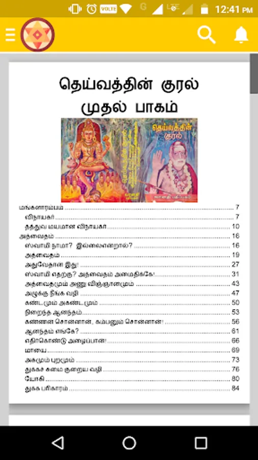 This is a highly engrossing, inspirational and thought provoking book. This publication, by Bharatiya Vidya Bhavan, is an tamil translation of seven volumes of "Deivathin Kural", which contains talks of His Holiness Kanchi Mahaswami, in Tamil. This book is divided into several chapters.