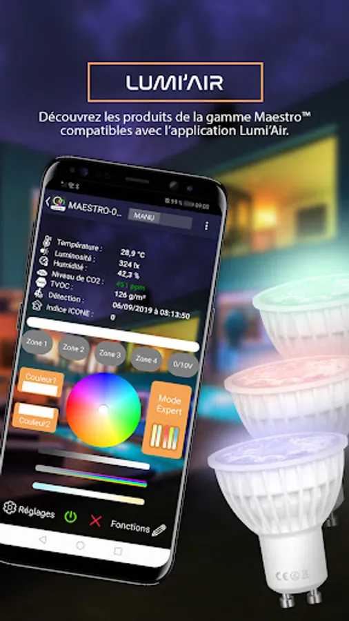 The Lumi'Air application also gives you information on the luminous flux (expressed in lux), the temperature, the humidity level and even the CO2 level present in your room. You will be warned if your room is saturated with carbon dioxide or if the humidity level is too high. With Lumi'Air measure, control and manage your indoor environment!