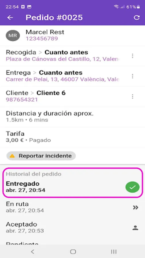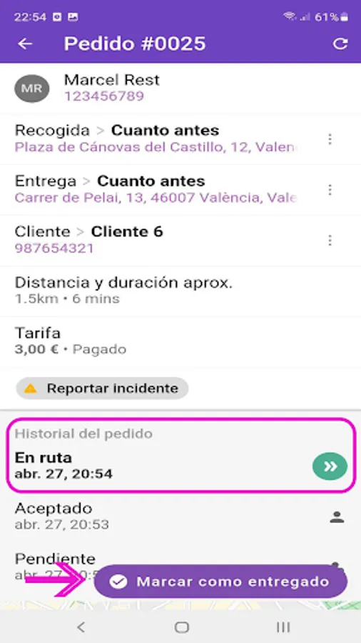Cuando entregas el pedido en el destino final lo marcas como entregado.