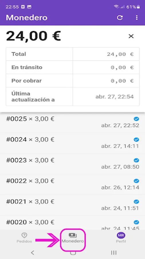 Todos los servicios de reparto que finalices quedan registrados en un monedero virtual que se actualiza automáticamente también cuando el negocio ha liquidado los servicios de reparto que le hayas realizado y tu hayas confirmado que has recibido el cobro de los mismos.