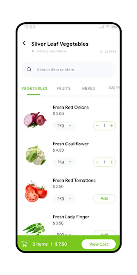 Delivoo has a total of 3 App templates for User, Vendor, and Delivery with 70+ screens. Users need to add a location to place orders including veg, fruits & more.