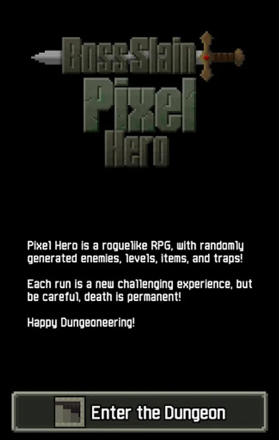 Pixel hero is a roguelike RPG with pixel graphics and simple controls. Randomly generated levels, high difficulty and a large number of things to learn.