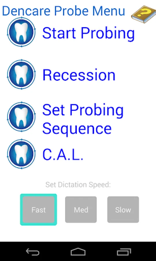 the documenting of a patients probing numbers created a need for a better solution. That solution is the World’s First Android Based Dental Probing Software Application the DenCare Probe! This Software is Real and not a game or some flash card tutorial to help you study. This software is made to store your patients probing data, and we ask you the Dental Health Care Professional to follow your Country, State/Provincial or Regulatory Colleges standard’s and guidelines when it comes to Electronic Records Management .