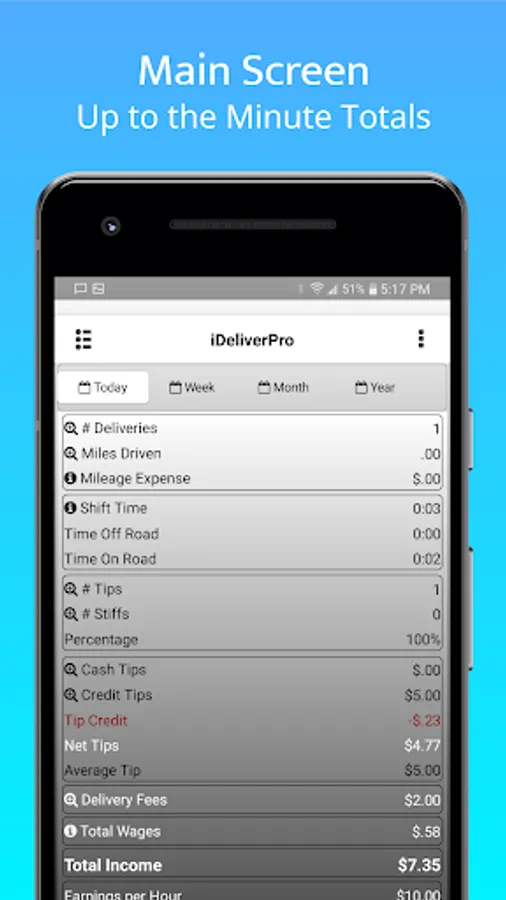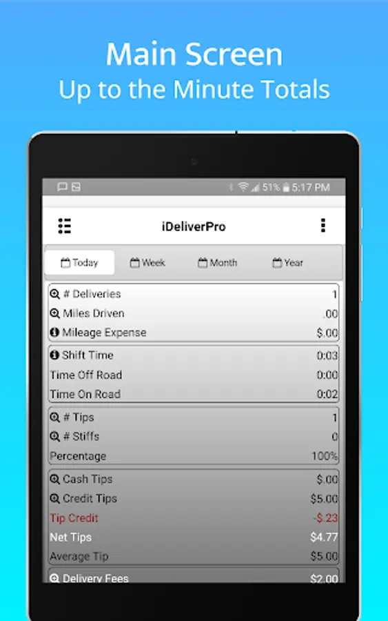 As you make your deliveries throughout the day, the main screen will update with every income category in real time.