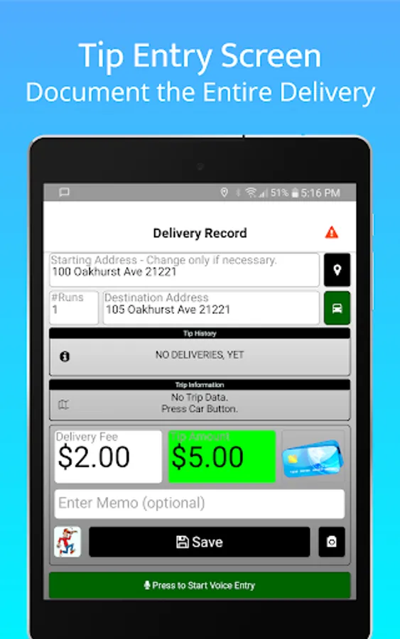 2) Make your deliveries. Enter your delivery address(es) and press Start. iDeliverPro will immediately provide you with a Tip History of the address (if you've delivered there, before) and display the Trip Time and Miles to the address. Need Directions, too? Just press another button for an Apple Maps screen with the route preloaded. After the delivery is finished, enter you tip (hope you got one). If you also get a fixed delivery fee for each delivery, it will be recorded automatically. Press Save and end the delivery. (Repeat)