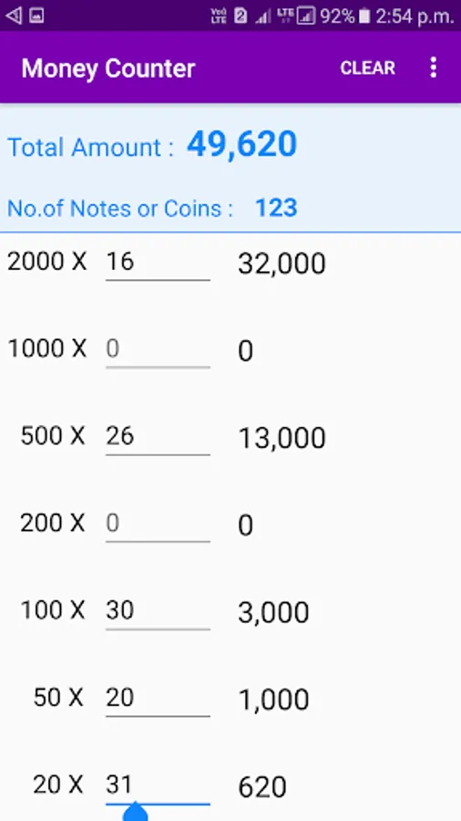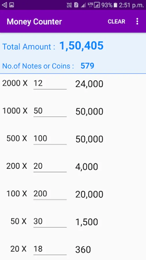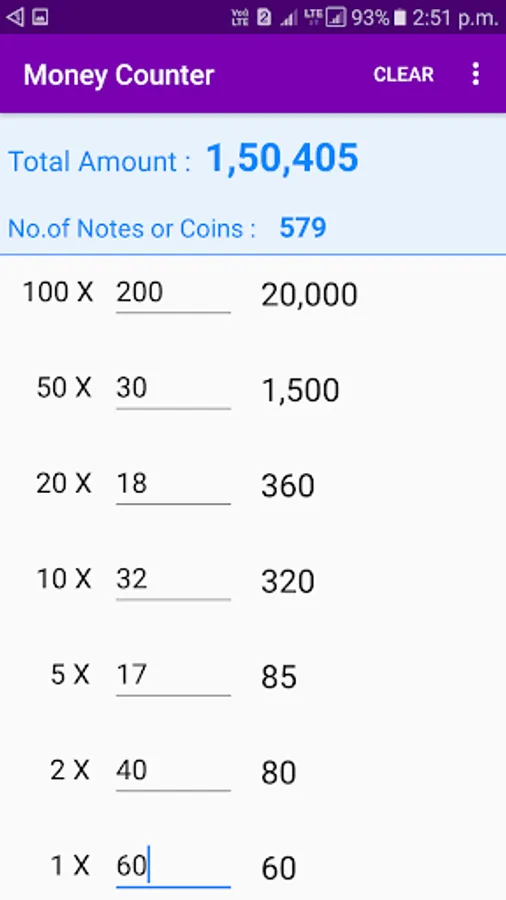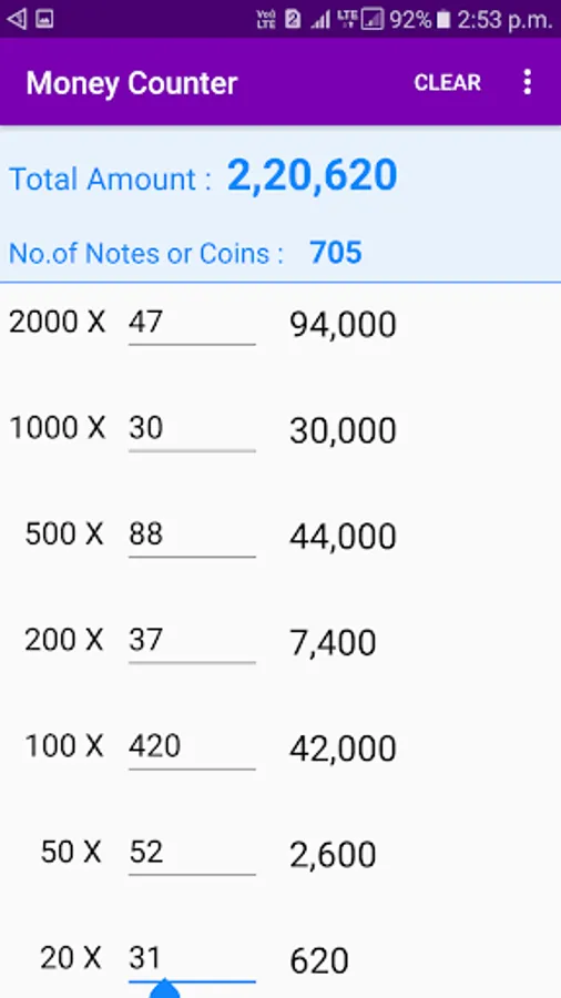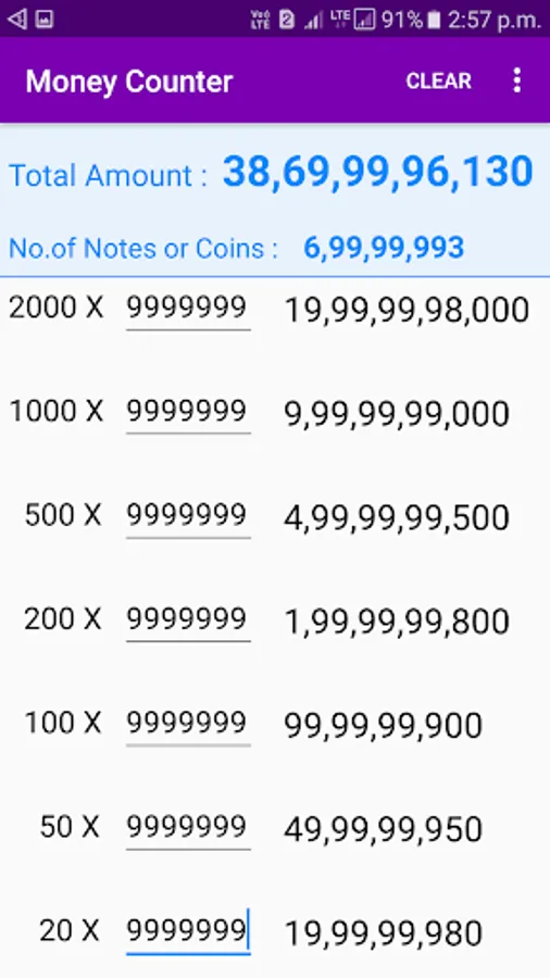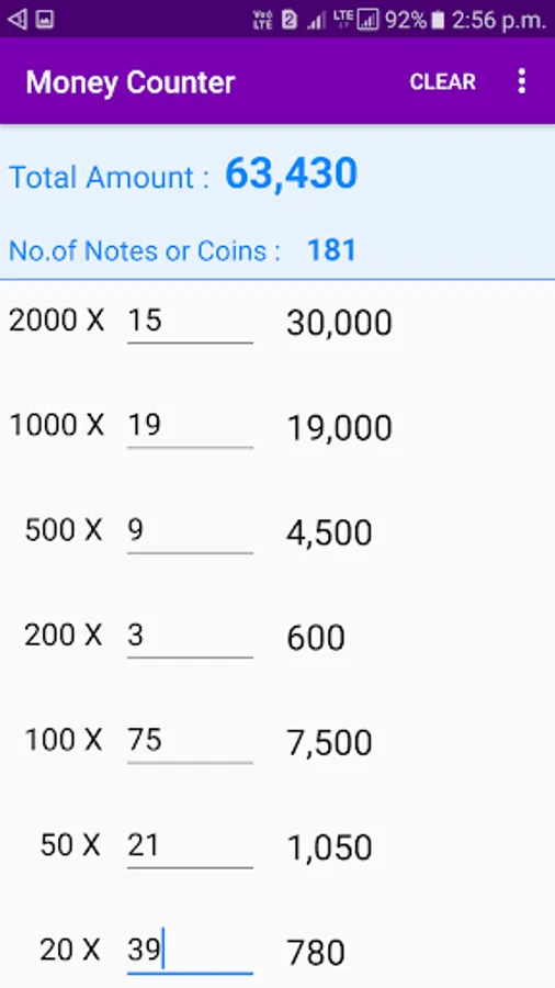 Easily Count Total Amount and No.of Notes or Coins by entering the count of each denomination