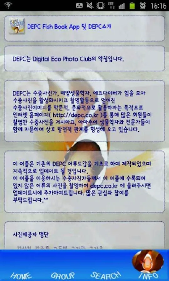 DEPC FISHBOOK APP is designed for those who are interested in scuba divers, underwater photographers and underwater creatures.