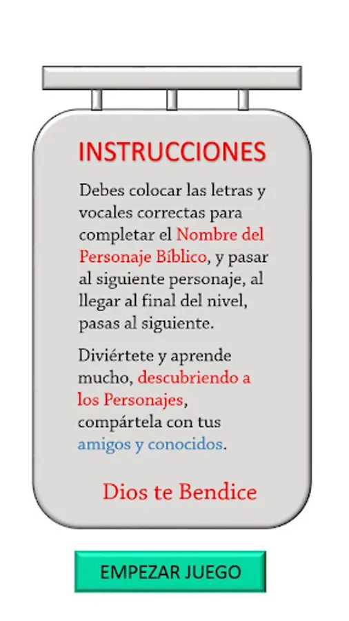 Have fun playing and discovering the name of the Biblical Character, the game asks you the question and you must complete the Name.