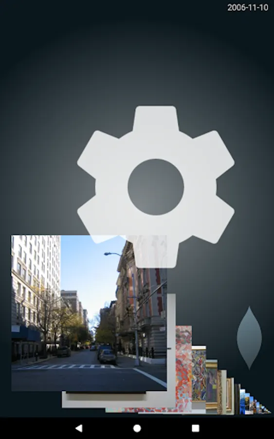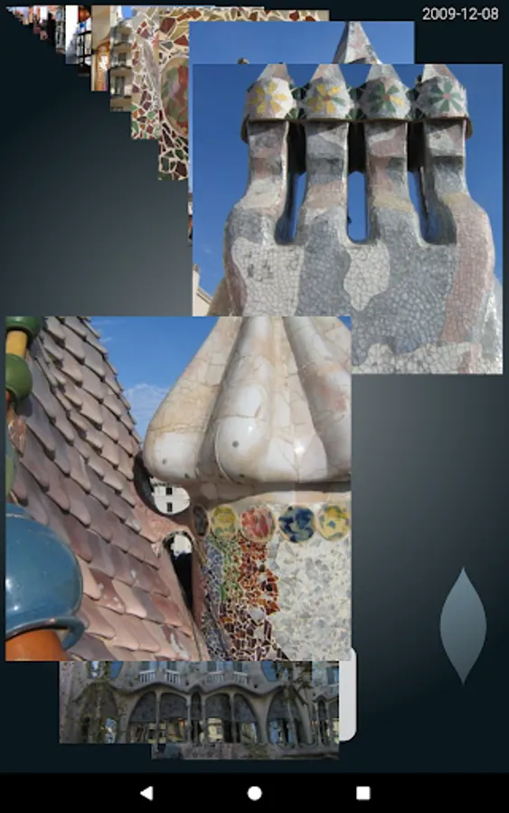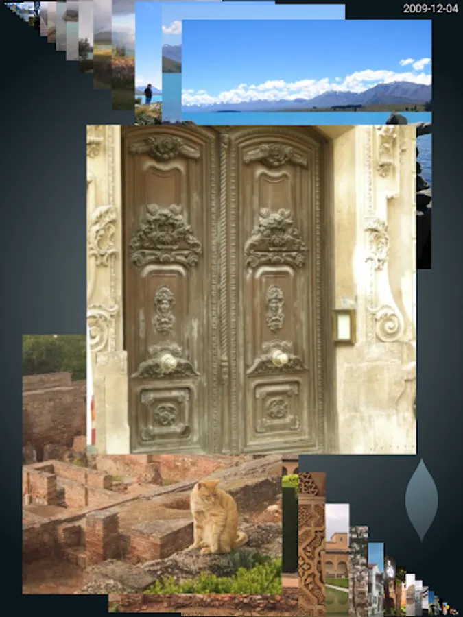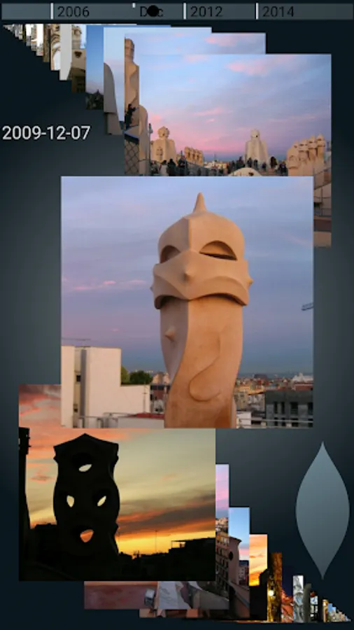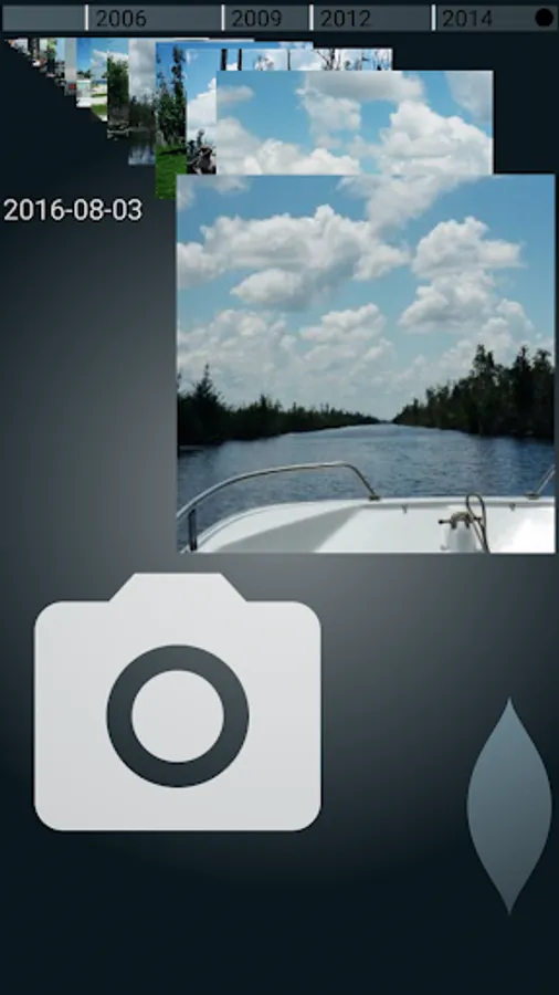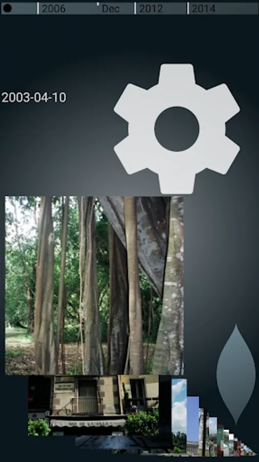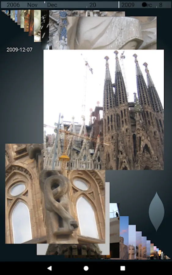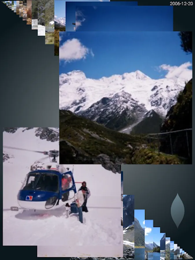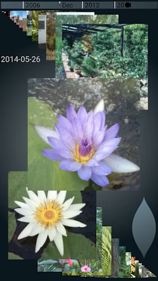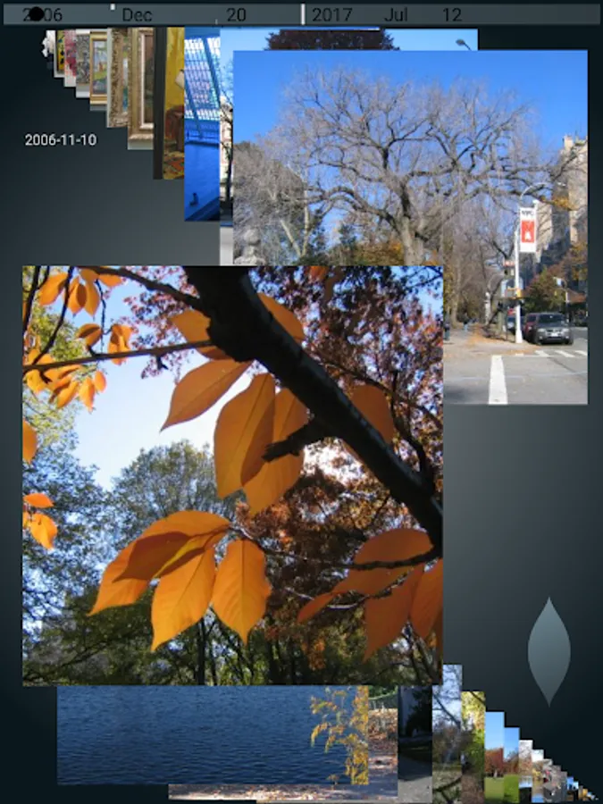 Your photos appear on a curved time stream. A leaf-shaped control widget is within easy reach of your thumb, even when holding the device in one hand. Touch-and-hold in the broad part of the widget, then slide the finger up or down to change the gliding speed. Note that tapping on the widget is ignored.