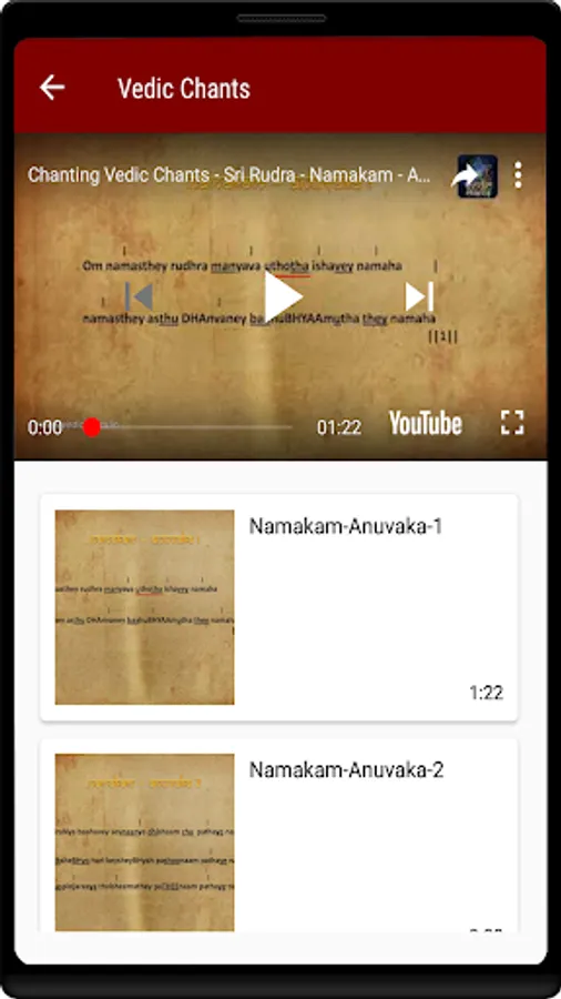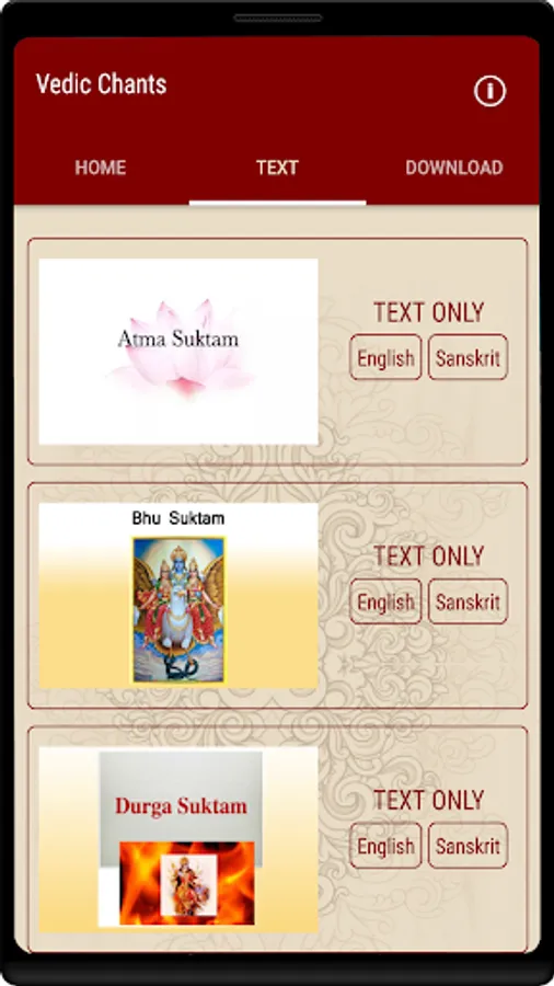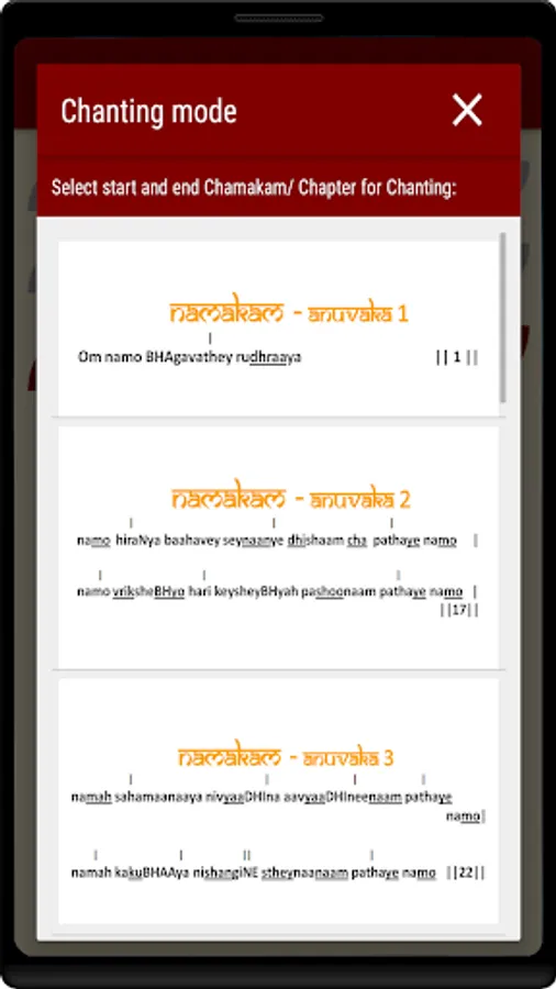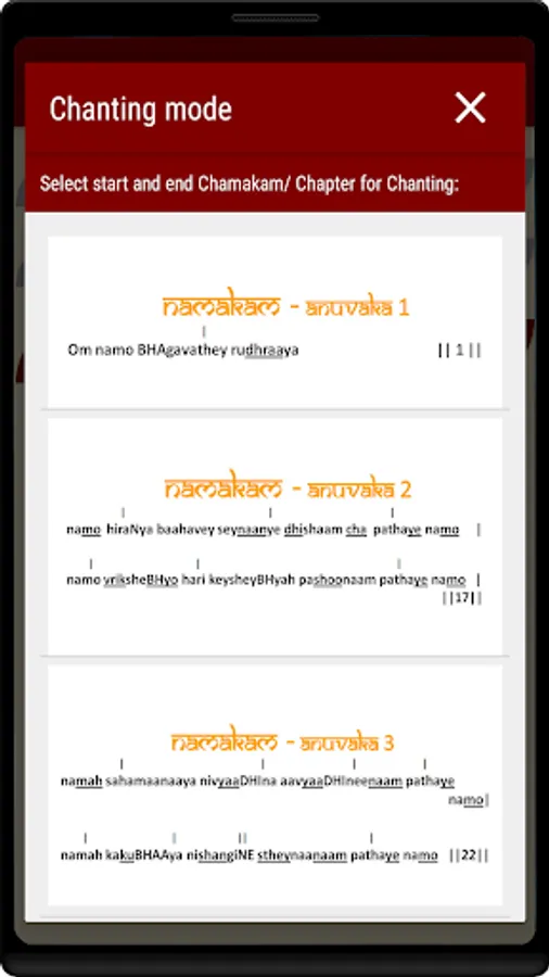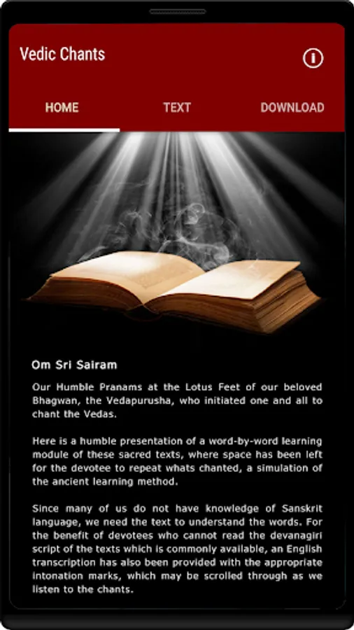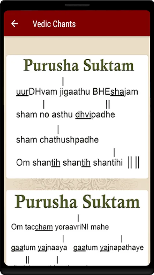 Since many of us do not have knowledge of Sanskrit language, we need the text to understand the words. For the benefit of devotees who cannot read the Devanagari script of the texts which is commonly available, an English transcription has also been provided with the appropriate intonation marks, which may be scrolled through as we listen to the chants.