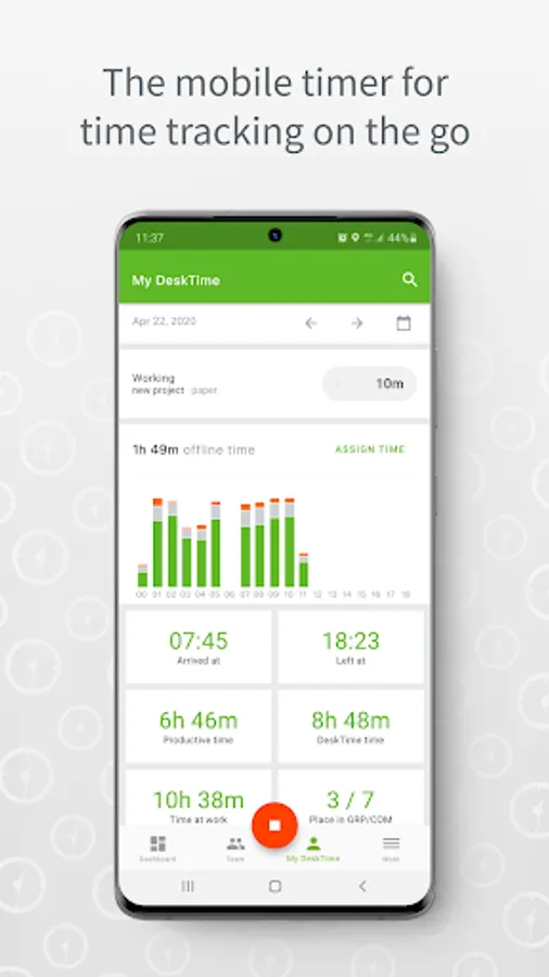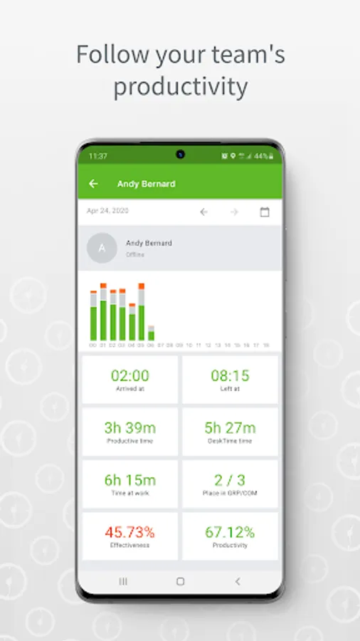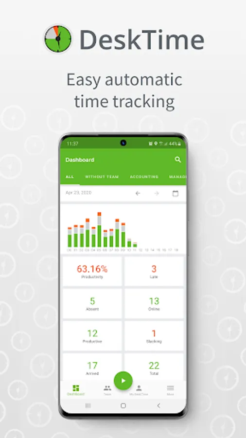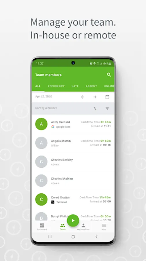 • See who's working, slacking, late, or absent in real-time – DeskTime's time tracker lets you remotely see the status of your team every day.