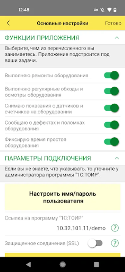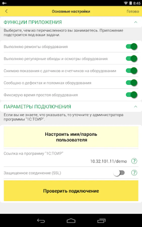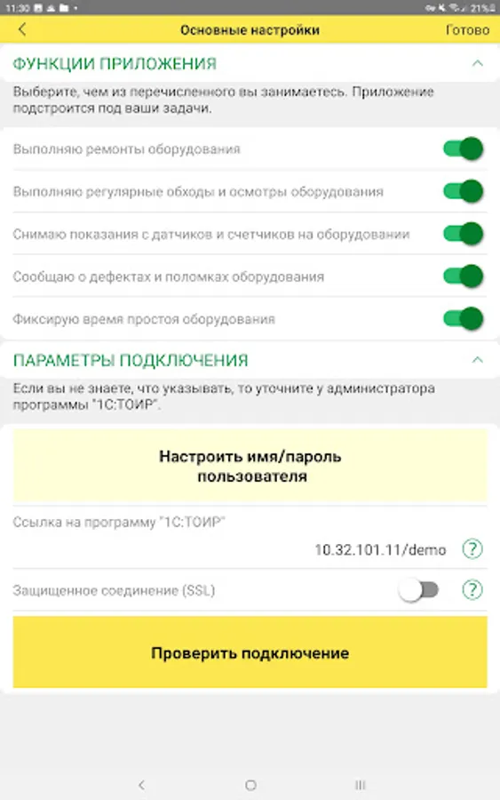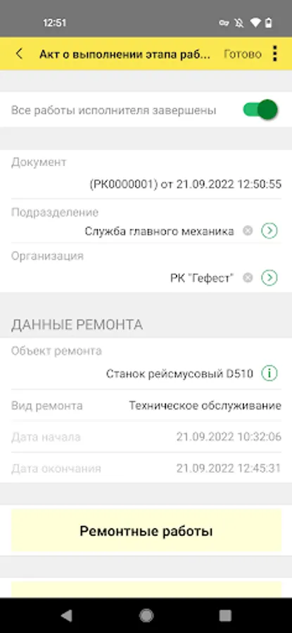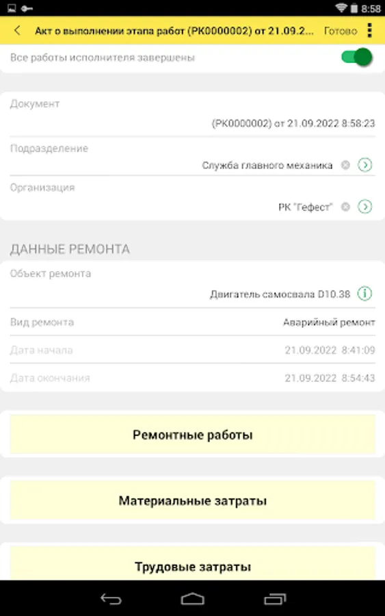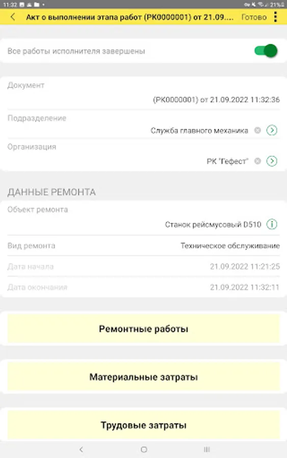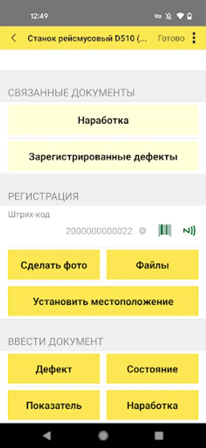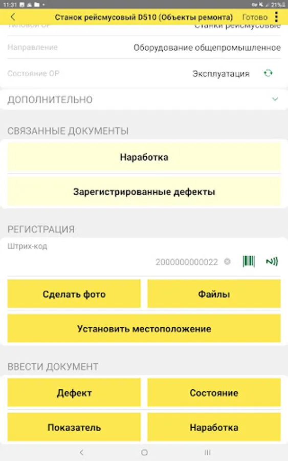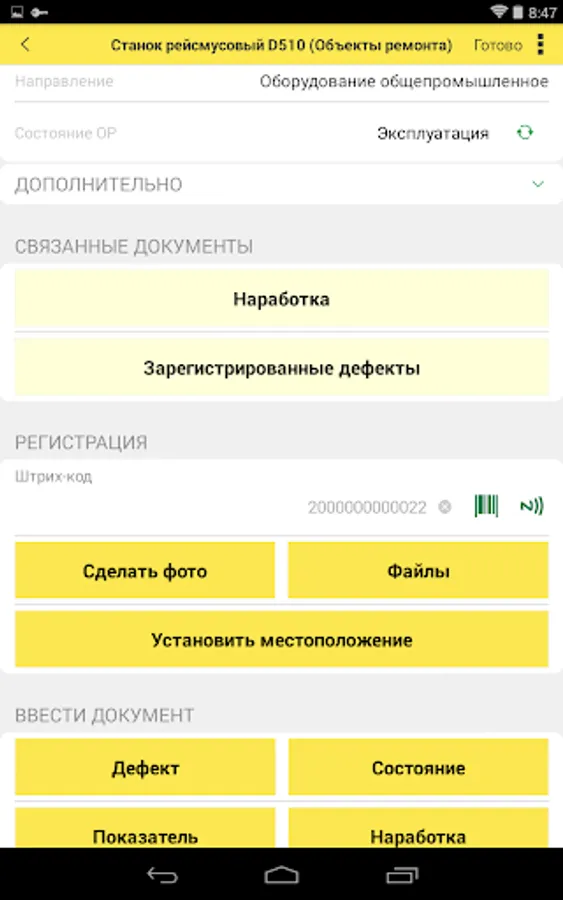 • Monitoring the presence of personnel at the facility (by NFC tag, barcode, geolocation). You can select a setting in 1C: TOIR KORP so that the input of documents (acts of completion) is available to the user of the mobile application only if he is near the repair object.