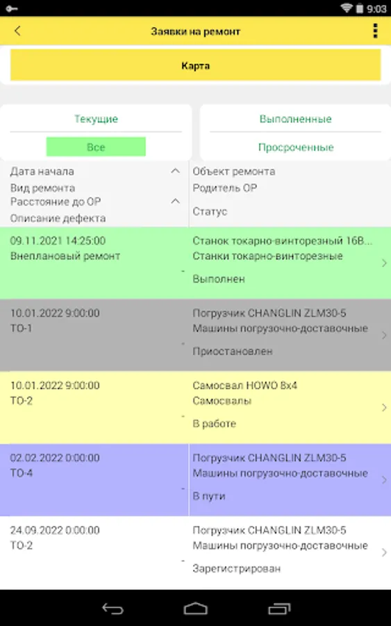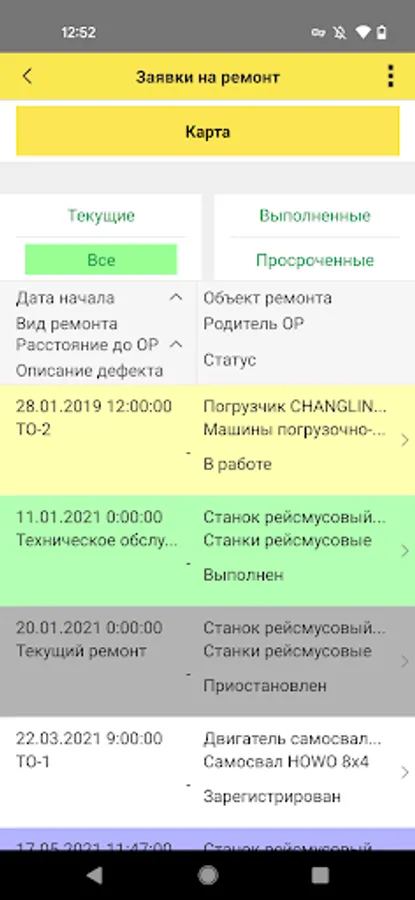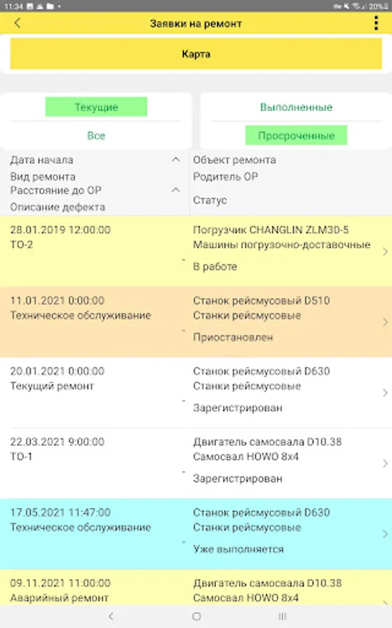 • Color marking of the list of applications allows you to quickly determine their status (depending on the criticality of the defect, condition, criticality of equipment or type of repair). For example, repair requests can be marked with different colors depending on their status: "Registered", "In Progress", "Suspended", "Completed", etc.
