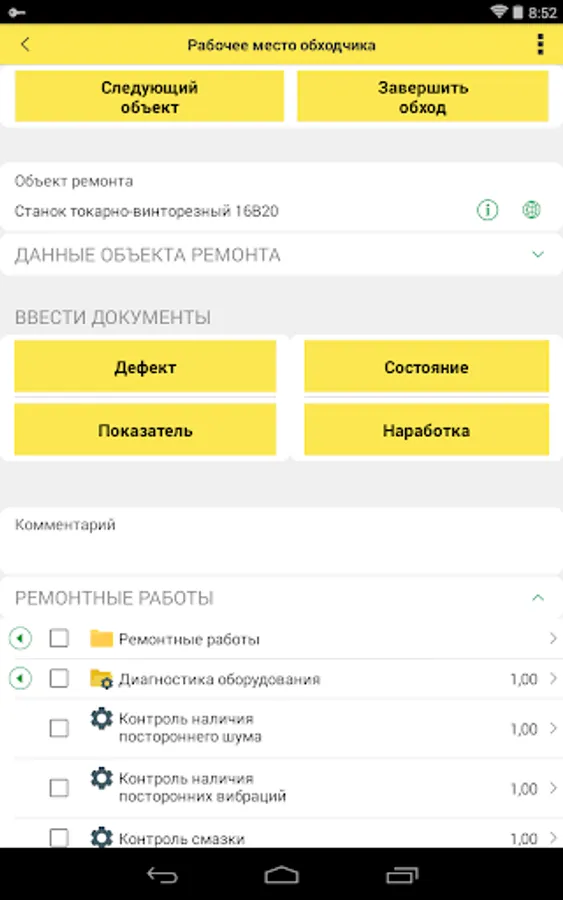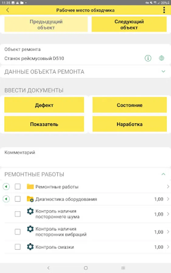 • Bypass objects according to the list of routine activities with the accompanying input of controlled indicators, operating hours, registration of defects and fixation of equipment states.