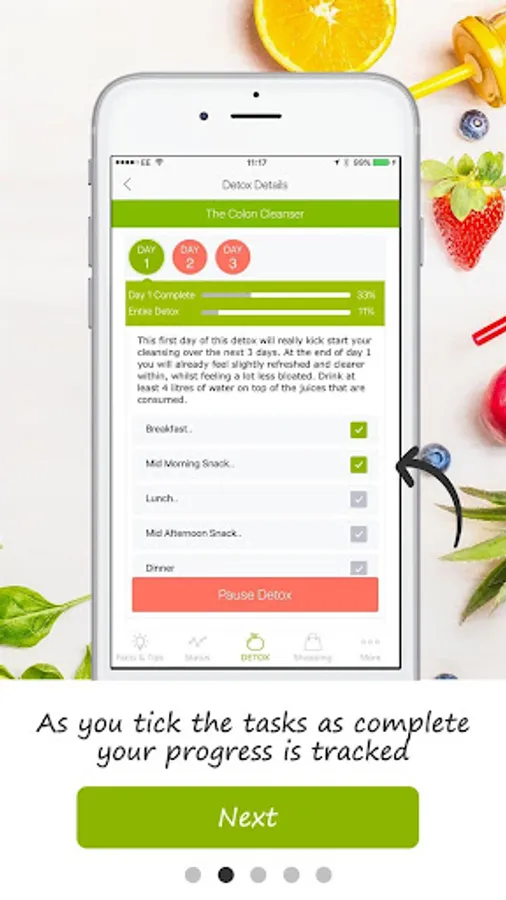 There are many detox websites, books, articles and apps that will tell you what to eat, drink and follow, but none provide the level of detail, versatility and practical functionality in their approach like Detox Pro. Our team of expert dieticians have designed a range of detailed healthy diet plans for women and men. All of the information is presented in a very structured and easy to follow manner. Helping take the stress away from the planning, tracking and managing of your entire detox.
