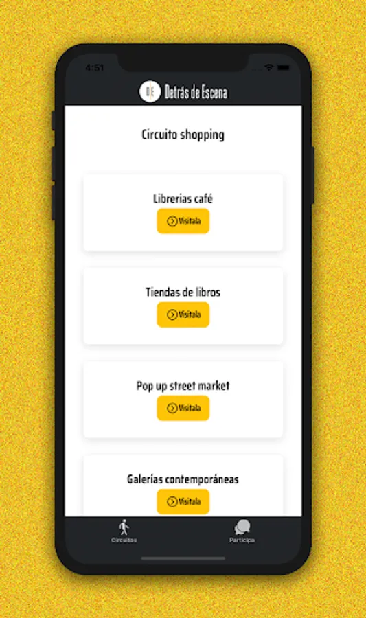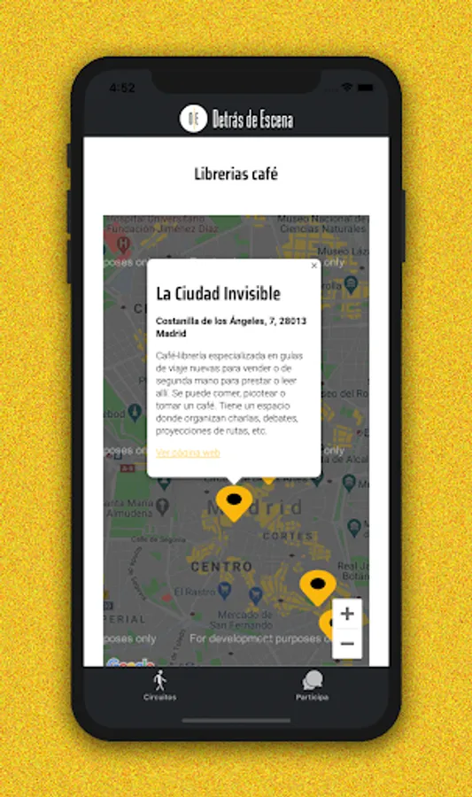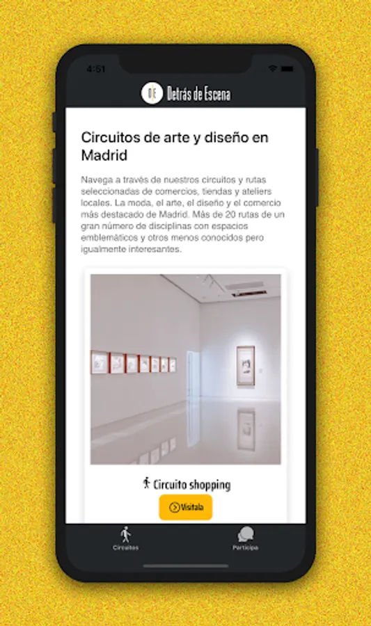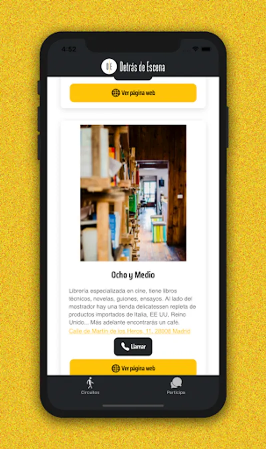 With the Behind the Scene APP you can discover circuits of shops and art and design ateliers in Madrid. Curious shops and emblematic establishments, unique in the city of Madrid. Classified by consumer philosophy of life, you can find avant-garde, classic, vintage circuits or circuits of art and design supplies. New circuits will be updated and uploaded. You can also send us suggestions for your favorite businesses.