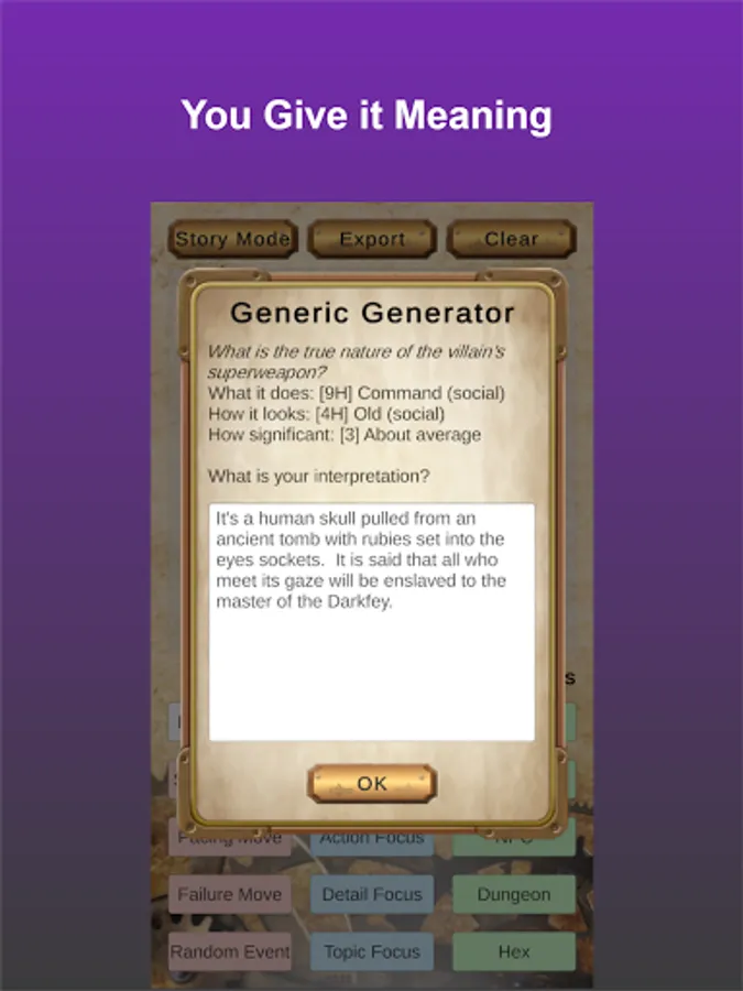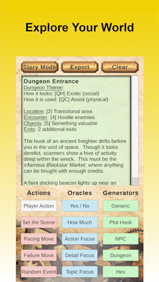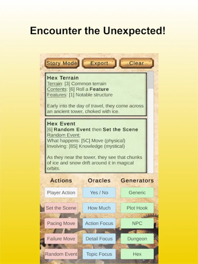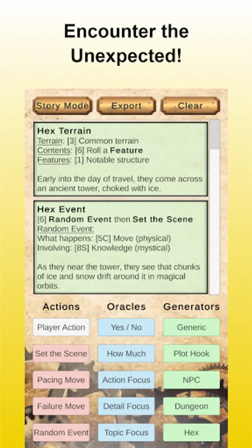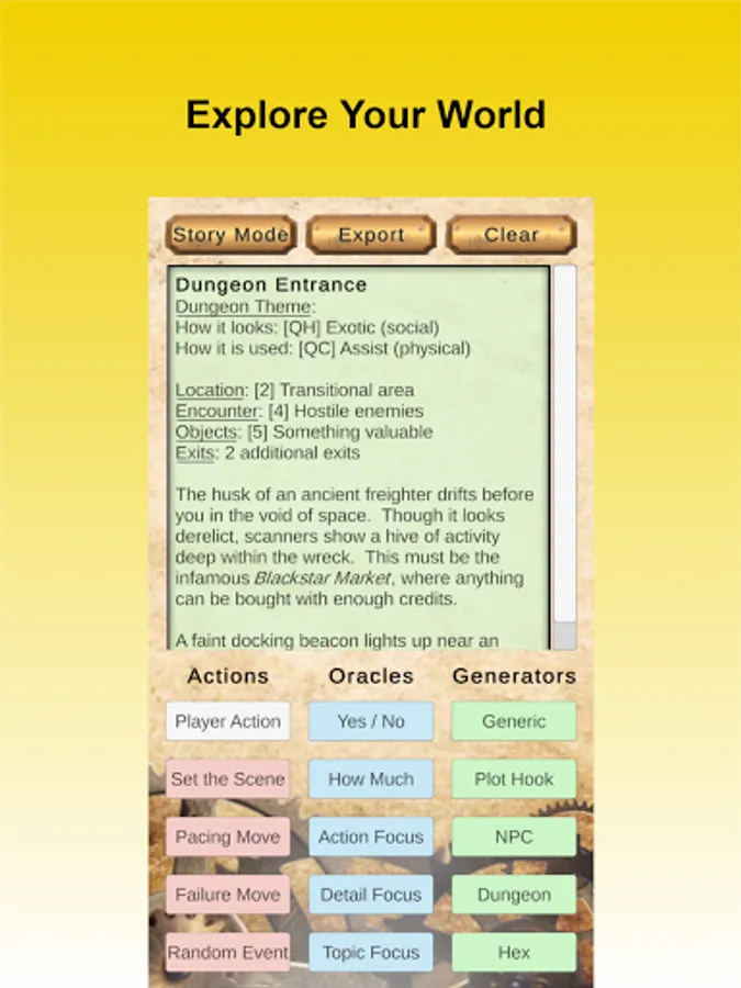 As you play, you may need to generate some quests to pursue, NPCs to meet, or dungeons to explore. Use the Generator actions to make new content whenever you need it. The Generic Generator is especially useful since it can give you ideas for magic items, space ships, evil organizations, and just about anything else you can think of.