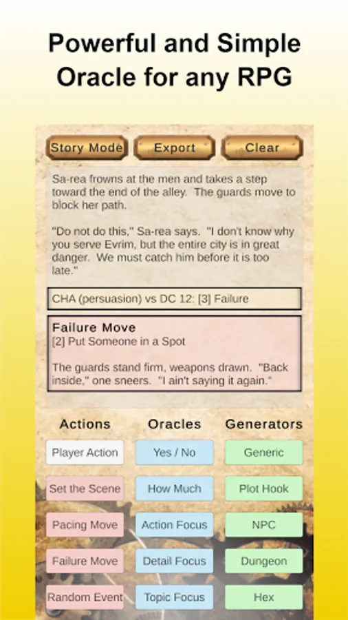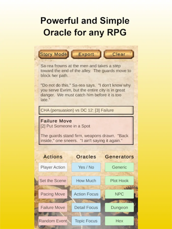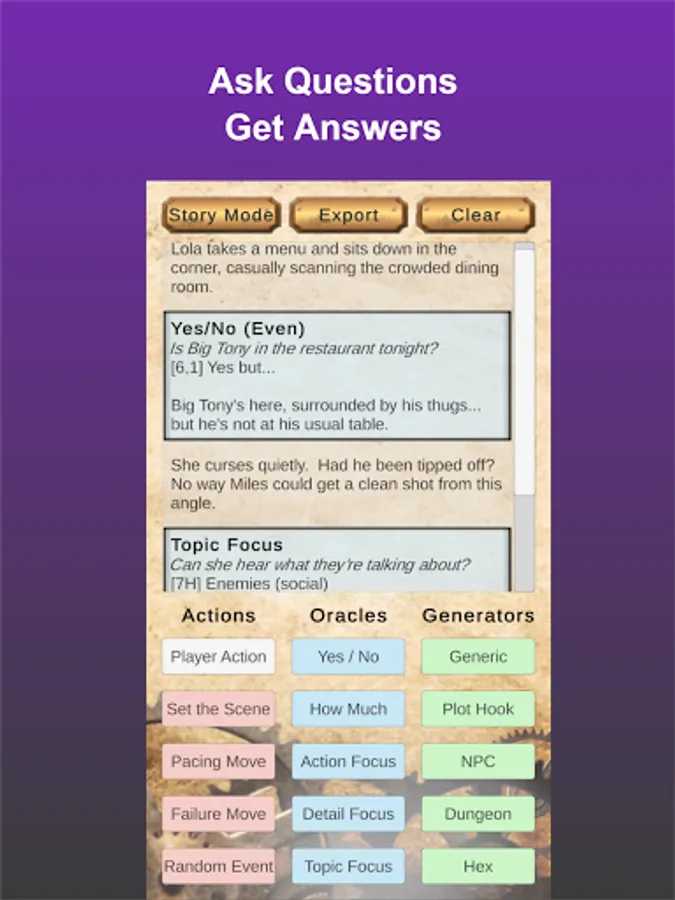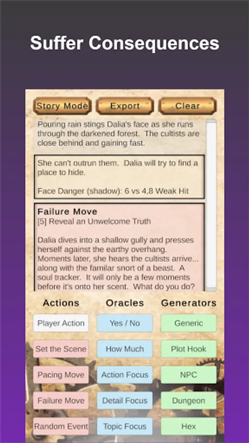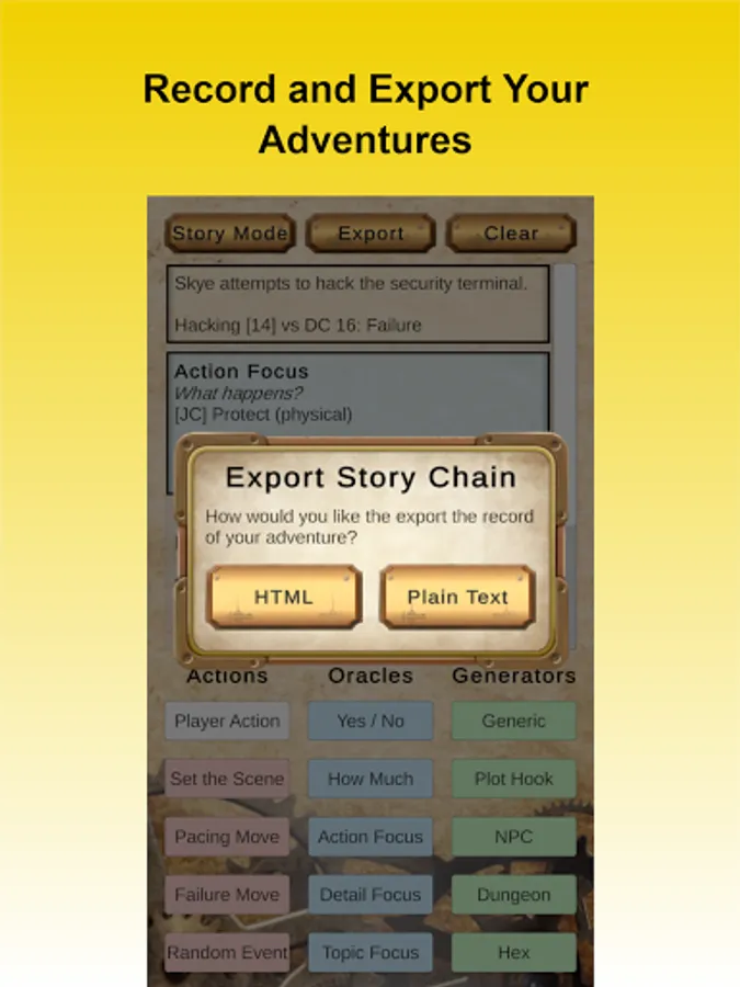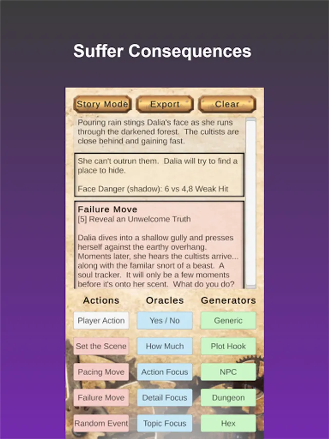 As you play, you may need to generate some quests to pursue, NPCs to meet, or dungeons to explore. Use the Generator actions to make new content whenever you need it. The Generic Generator is especially useful since it can give you ideas for magic items, space ships, evil organizations, and just about anything else you can think of.