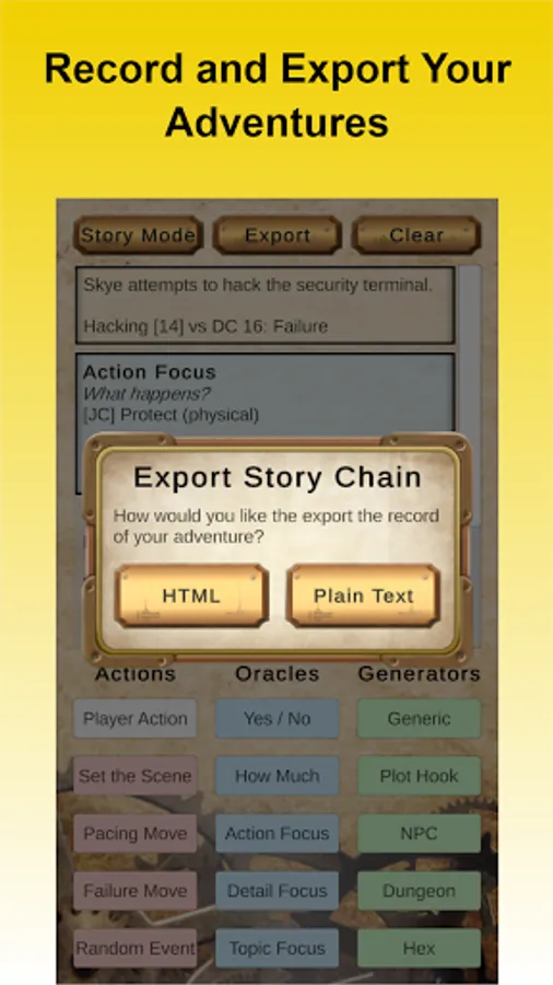When you're done playing, click the Export button to save your story chain as an HTML file or Plain Text file. You can open the file in a web browser to look back on your adventures, or share it with others online.
