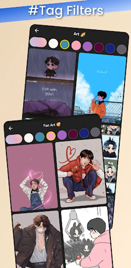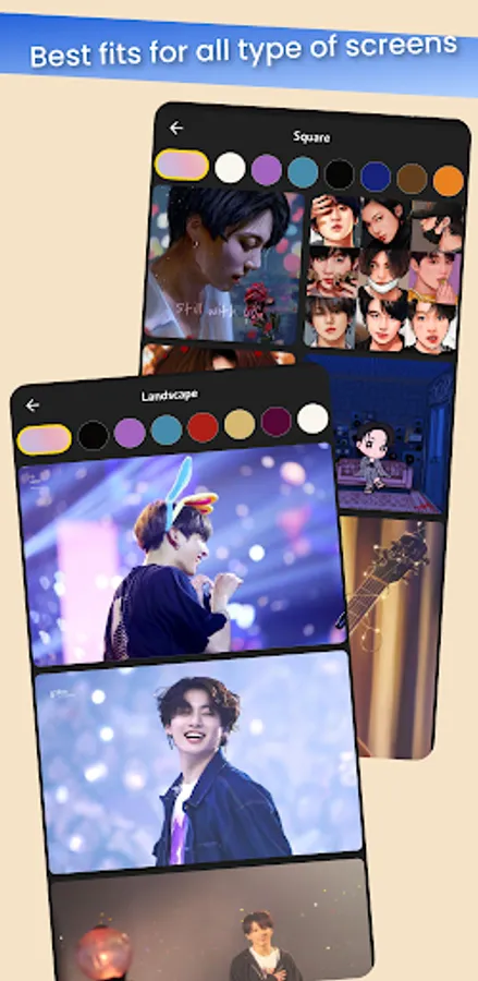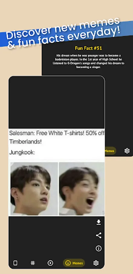 Jeon Jungkook AIO app with Landscape, Portrait & Square, Color Sorted Jungkook Wallpapers, categorized across various Tags, Hilarious BTS Jungkook Memes, Trending Jungkook Videos, cool Jungkook GIFs & lots of Jungkook Fun Facts! presented into responsive and fast app UI ⚡