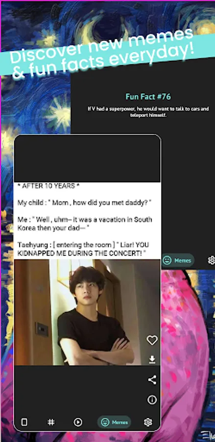 V - Kim Taehyung AIO app with Landscape, Portrait & Square, Color Sorted V Wallpapers, categorized across various Tags, Hilarious BTS V Memes, Trending V Videos, cool V GIFs & lots of V Fun Facts! presented into responsive and fast app UI ⚡