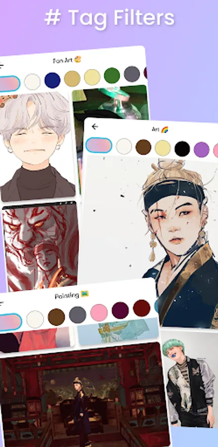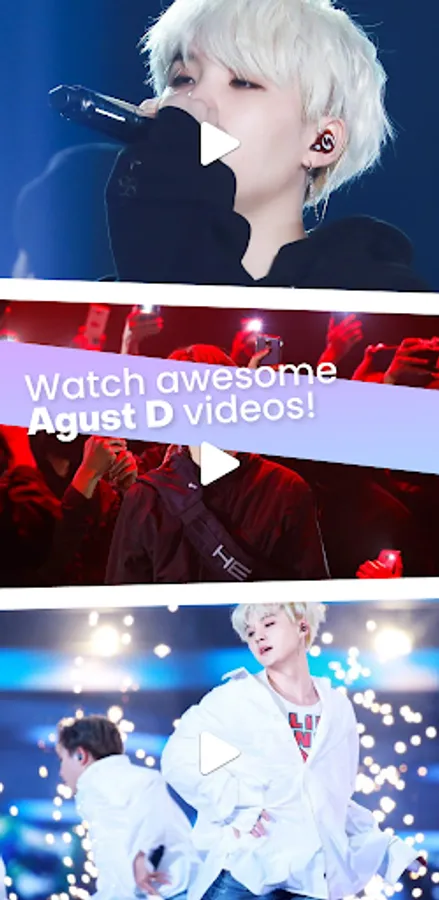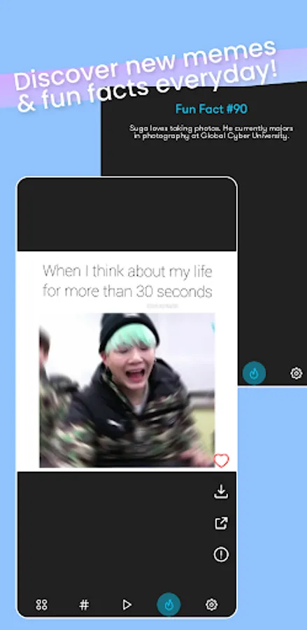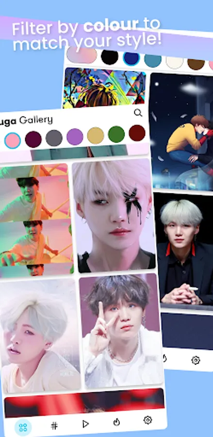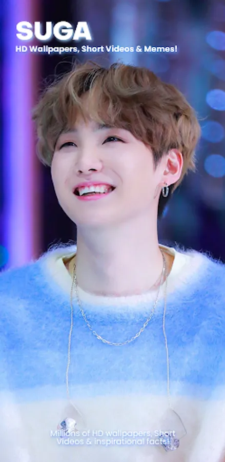 Suga AIO app with Landscape, Portrait & Square, Color Sorted Suga Wallpapers, categorized across various Tags, Hilarious BTS Suga Memes, Trending Suga Videos, cool Suga GIFs & lots of Suga Fun Facts! presented into responsive and fast app UI ⚡