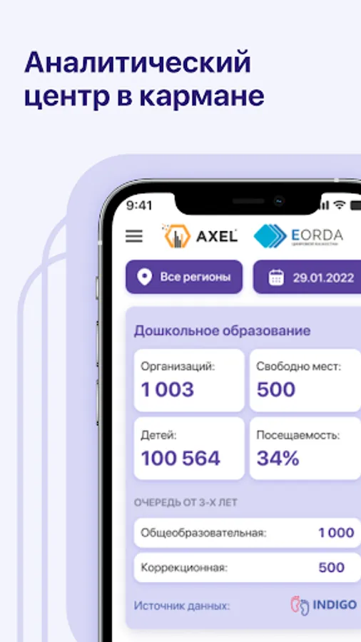 Connects to various data sources. And it allows you to receive operational data on the state of each subordinate organization: the need for places, the contingent of organizations, children, teachers, and much more.