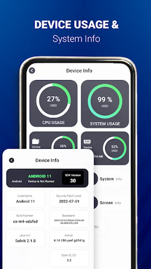 - Get all information related to system, device, battery, screen of you phone.