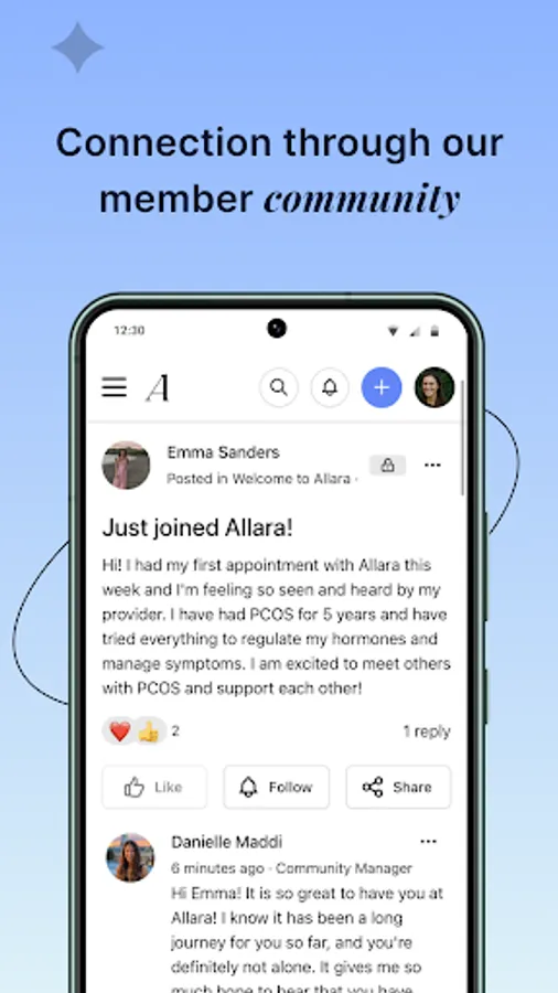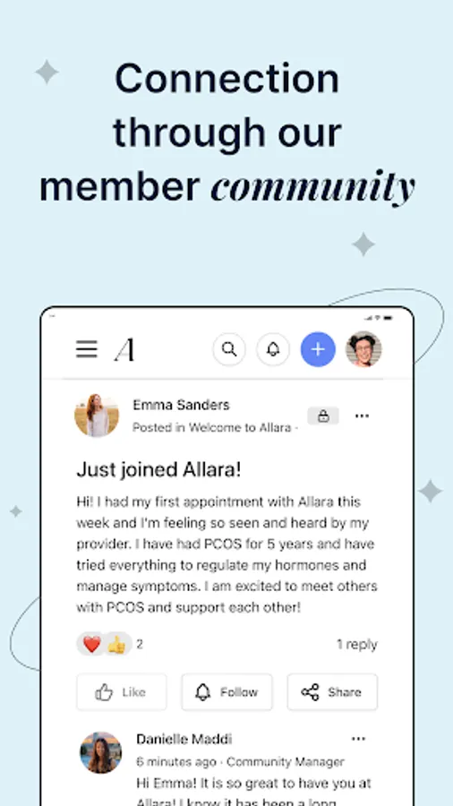 Existing patients can use the Allara app to communicate with providers, book video appointments, track health goals, and discover healthy recipes & educational content.