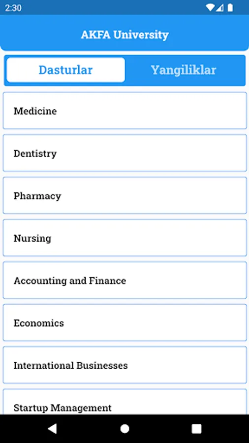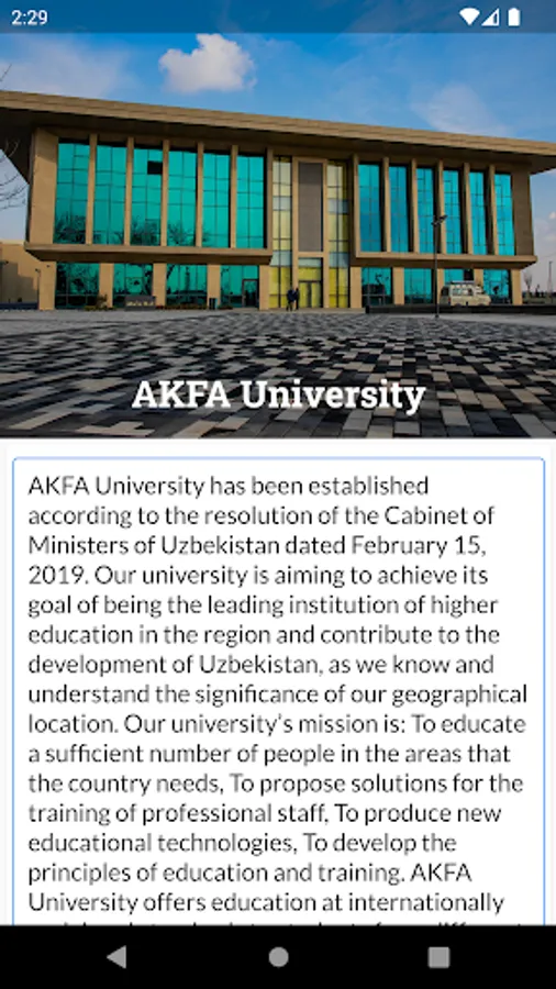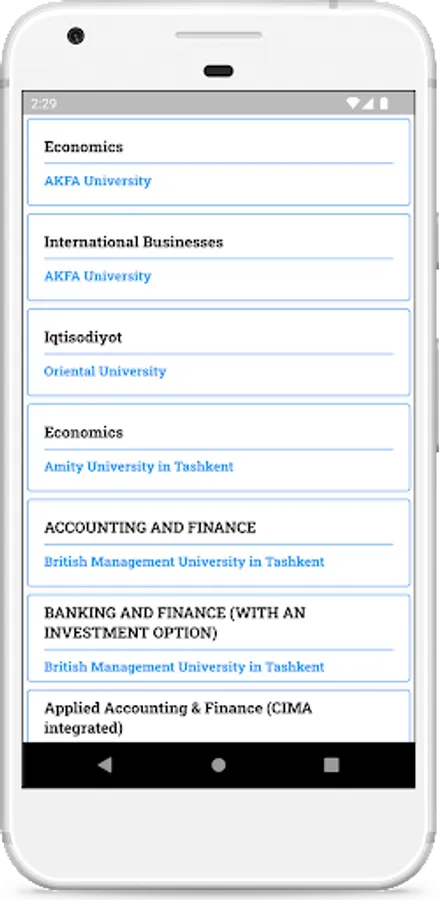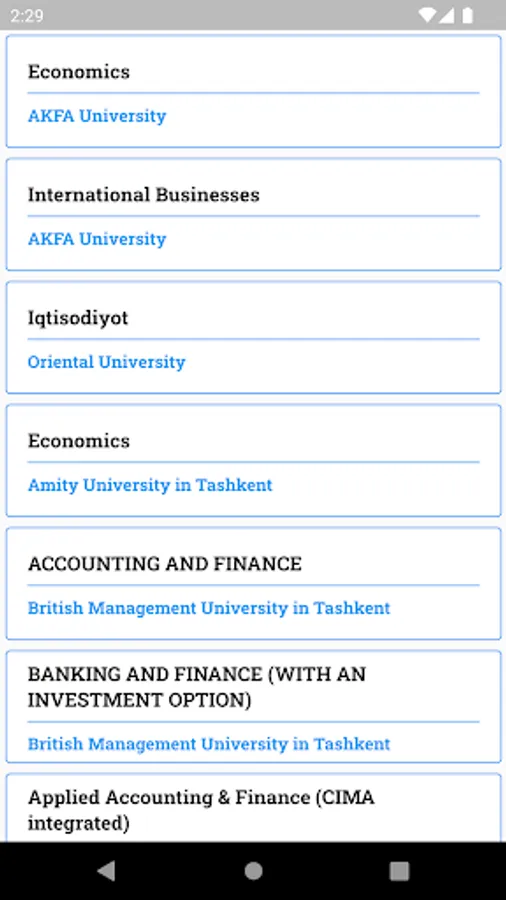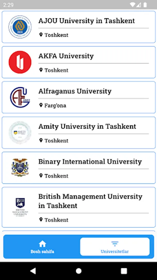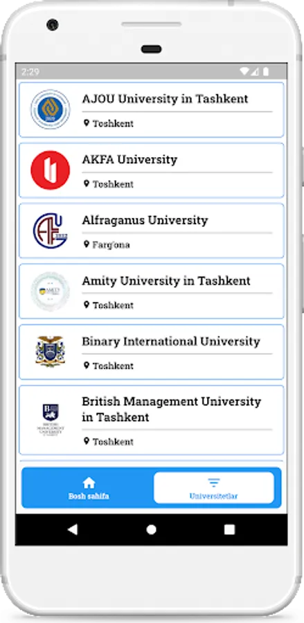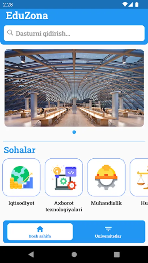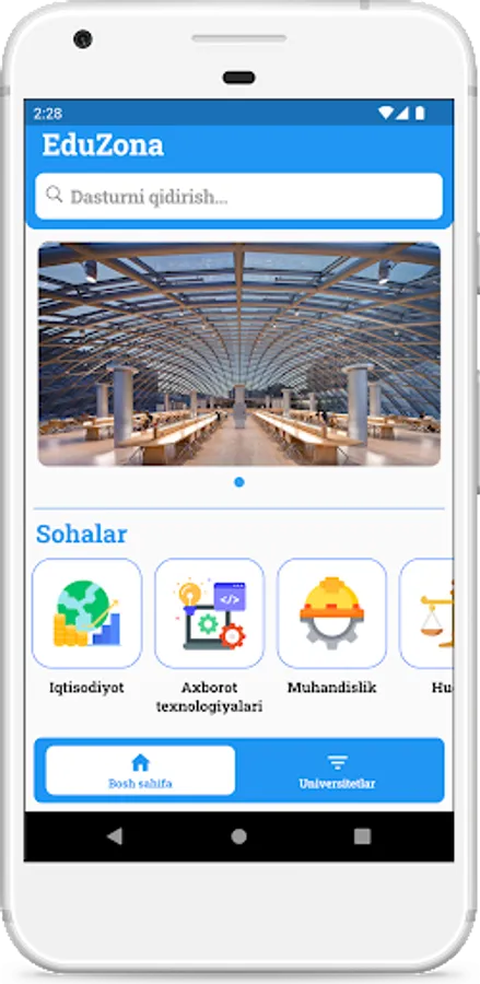 EduZona bu O'zbekistonda joylashgan xalqaro va xususiy oliy o'quv yurtlari haqida ma'lumot beruvchi portal. Ushbu dasturda, foydalanuvchi universitetlarga oid so'ngi yangiliklar, universitetlar haqida ma'lumot va mavjud dasturlar haqida doimiy ravishda xabardor bo'lib turadi.