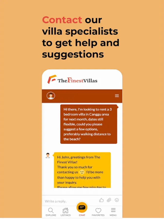 - Contact our Villa Specialists through the app’s chat system or by emailing us. Our specialists will be available to help you find the perfect accommodation and to organise any service you might requests (from daily cars with drivers to personal chefs)