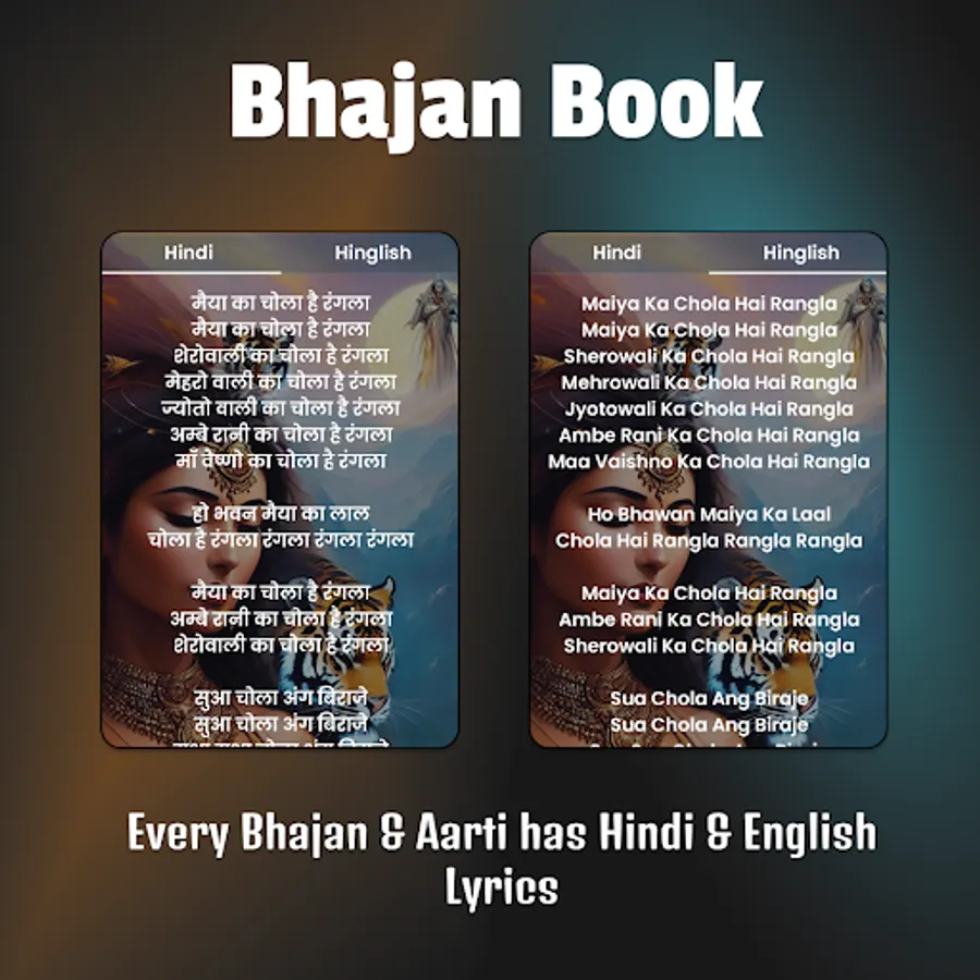 ऐप में भक्तों के चयनित देवता की भक्ति को व्यक्त करने वाले भजनों का विस्तृत संग्रह है। इन गीतों में देवताओं की प्रशंसा होती है, जिनमें मां शेरावाली, भगवान शिव और बहुत से अन्य शामिल हैं। ऐप में हर गीत के हिंदी और अंग्रेजी शब्दों के बोल होते हैं, जो उपयोगकर्ताओं को गीतों के मतलब को समझने और उसे समझने में सहायता करते हैं।