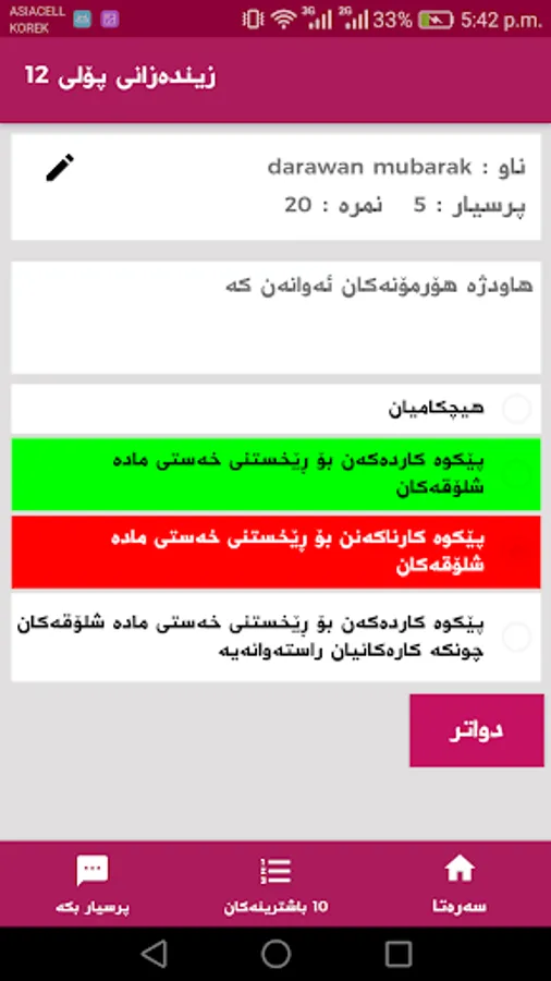 ههروهها تاقیكردنهوه دهكهیت له تهواوی كتێبهكهدا و پاشان نمرهكهت بۆ دادهنرێ.