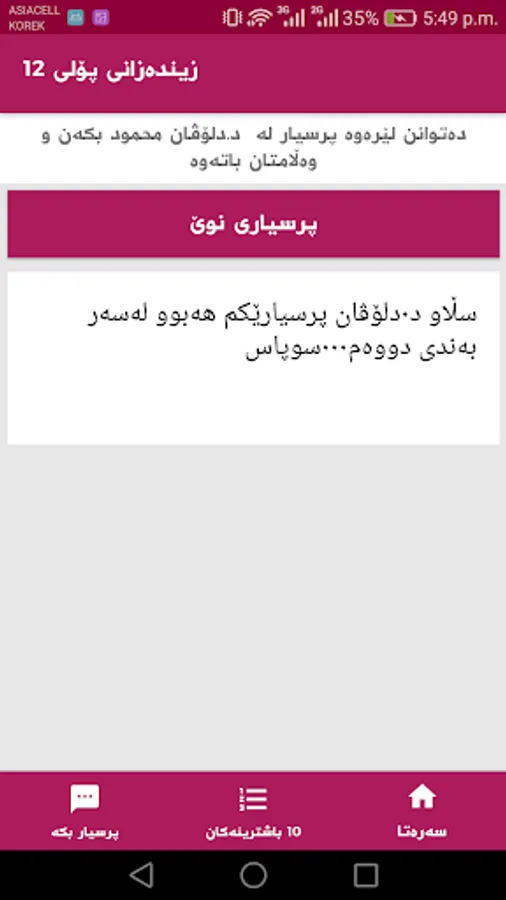 ئهم ئهپه تایبهته به پرسیار و وهڵامی لهسهر كتێبی پۆلی ١٢ كه بهشێوهی بهند جیاكراوهتهوه لهگهڵ پرسیاری وزاری به جیا كه زیاد له ١٠٠٠ پرسیار له خۆ دهگرێت كه لهلایهن د.دلۆڤان فائق محمود مامۆستای زانكۆ و خوێندكاری دكتۆرا له ئهمریكا ئامادهكراوه ، لهگهڵ چهندین ئامۆژگاری بۆ خوێندكاران كاتی تاقیكردنهوه و خوێندنی وانهكان ...