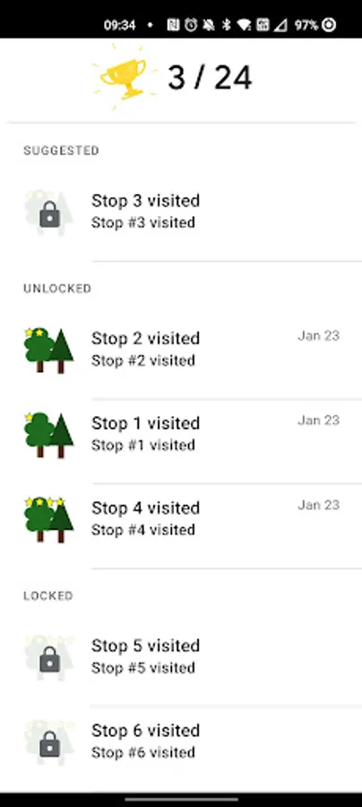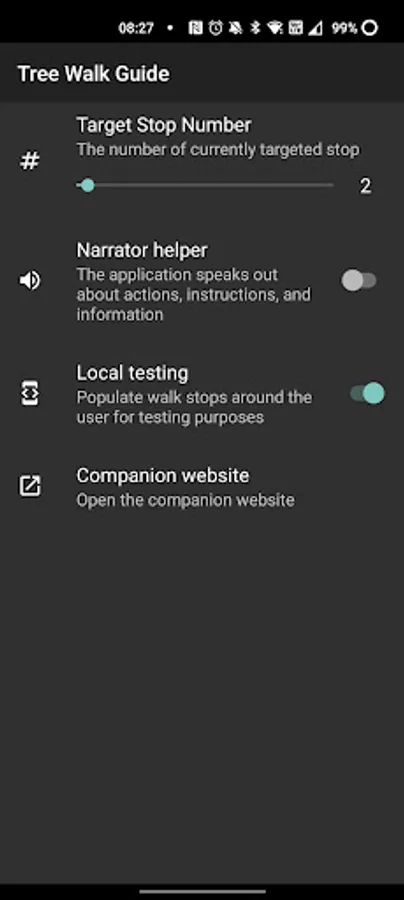 Local testing: (work only if Android developer mode is unlocked) go to the preferences and turn on local testing. Restart the app and it'll populate a few stops from the CSU Fresno walk meta-data but modifies the GPS coordinates to place them ahead of you 10m apart in a straight line. Geo-fence ares ~5m.