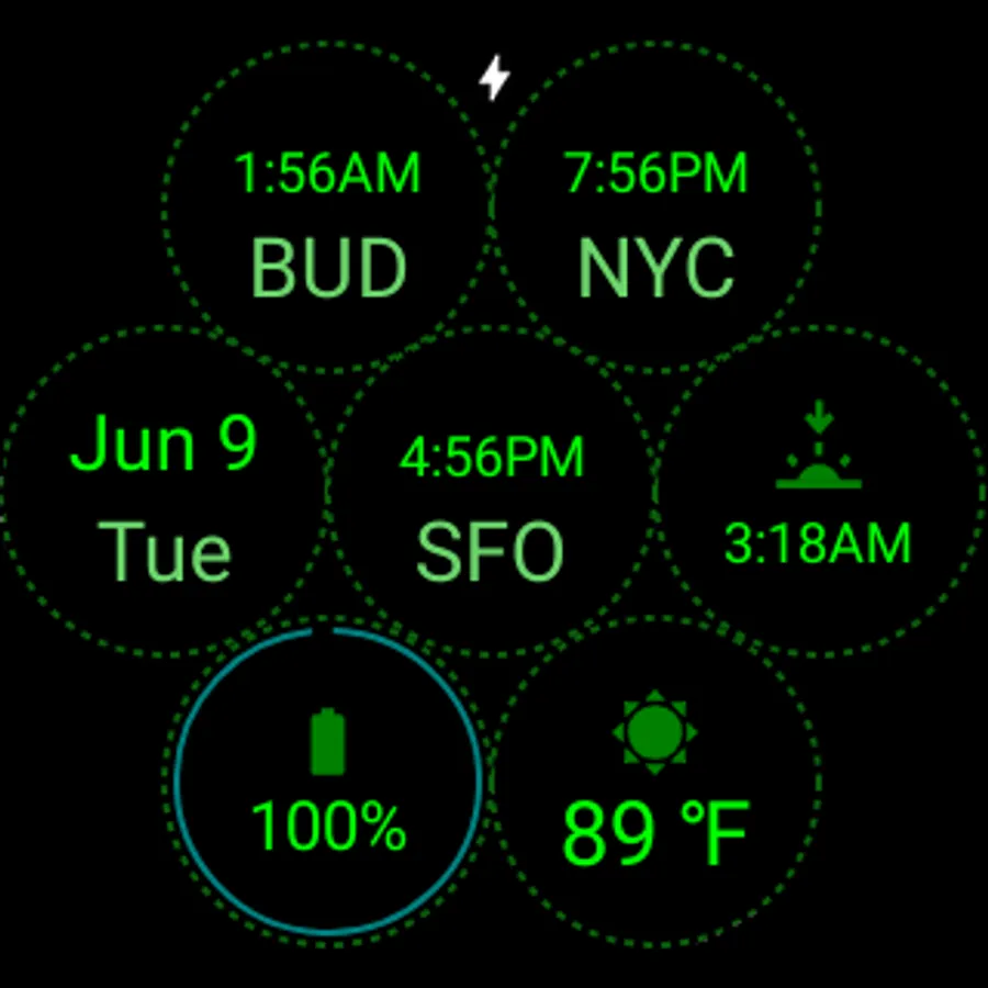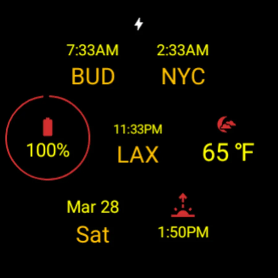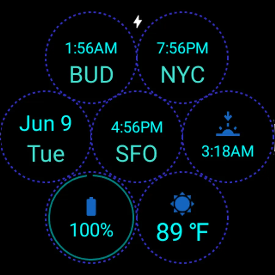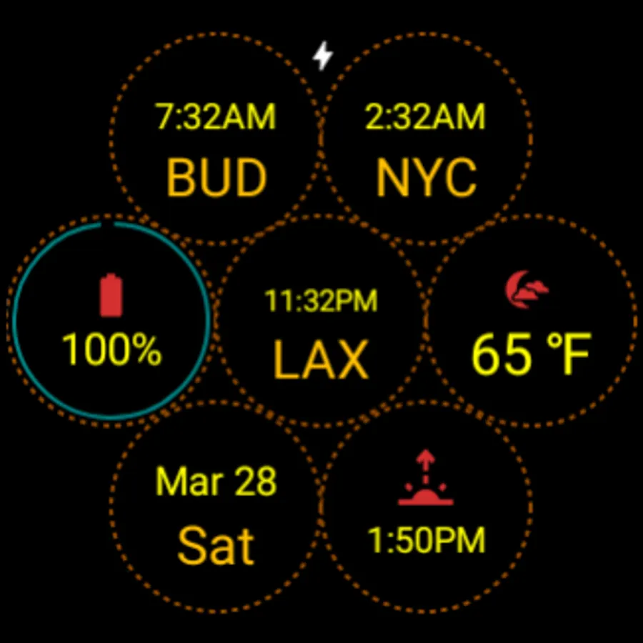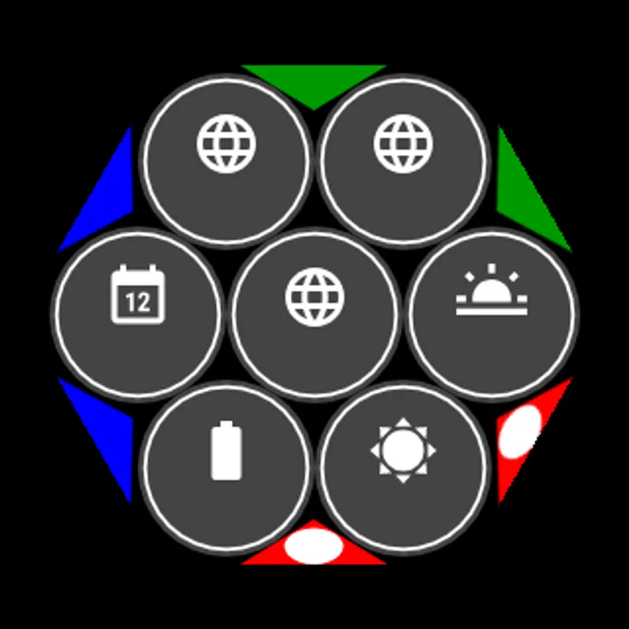 This is a free, open source project. Please submit any issues at https://github.com/CsabaConsulting/FlowerComplicationWatchFace/issues. This is a Wear OS Watch Face is comprised of complications only. They are all equal size of 1/3rd of the whole watch face and aligned in a flower shape. There are seven complication slots available. It's completely up to you what data you want to display, even including the time. I use an amber / vermilion / yellow / brown / red color scheme by default, avoiding blue which may age faster in some AMOLED displays. However blue and green schemes are available as well.