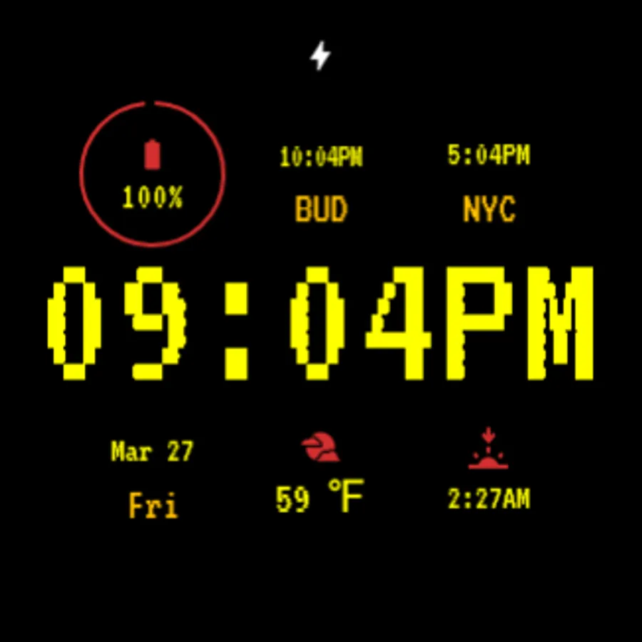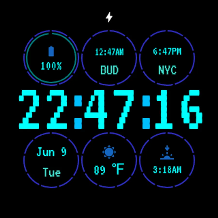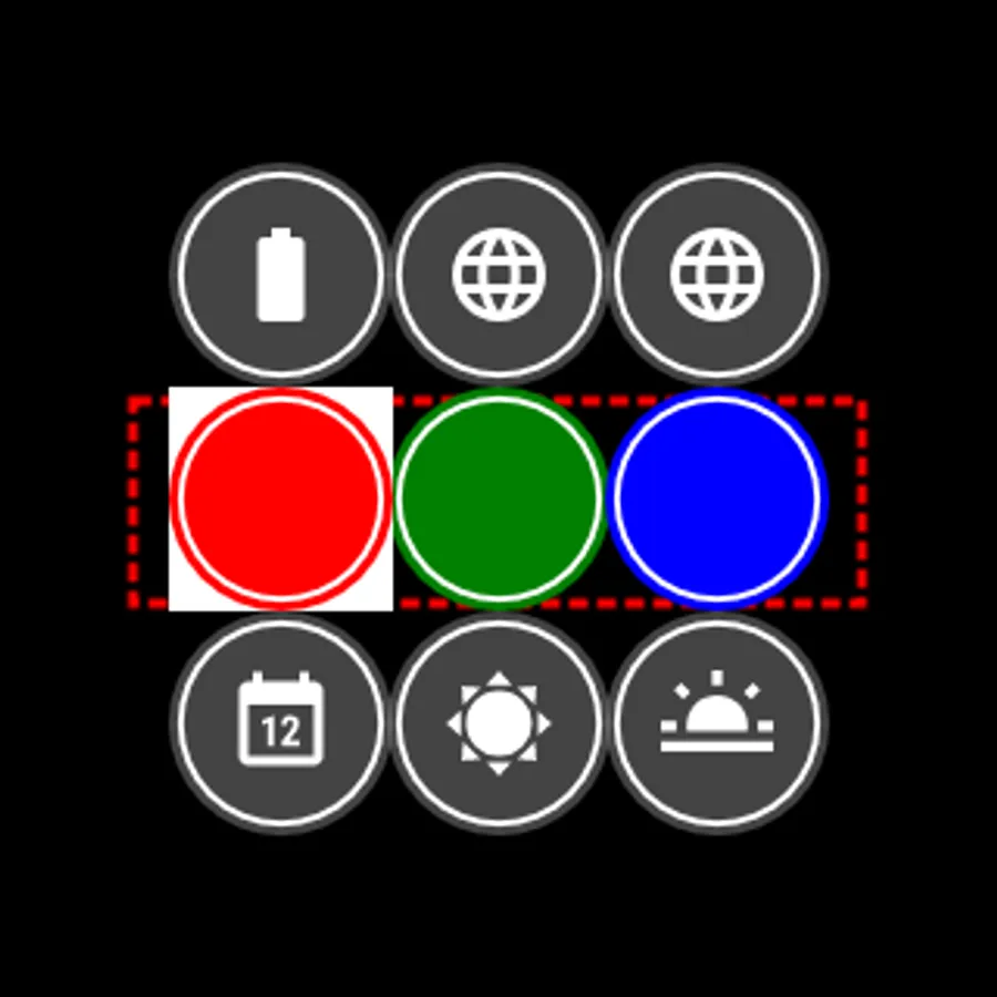 This is a free, open source project. Please submit any issues at https://github.com/CsabaConsulting/VFDWatchFace/issues. This is a Wear OS Watch Face with intentionally pixelated time display part for retro VFD feeling. The ambient mode displays AM/PM indication instead of seconds. The default color scheme is amber-yellow-red-vermilion because some AMOLED's blue color tend to age quicker, thus we may extend the life of the display by going red hue colors (otherwise I'd have gone cyan style to mimick some VFDs better). With v2.0 green and blue color schemes can be selected as well. The design offers 6 complication slots in two rows: one row is above the center time display and another row is below. All the complication slots are for small data.