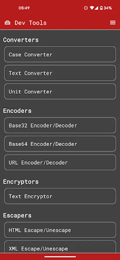 Dev Tools is multi-purpose Android and web application that contains over 18 useful tools for developers and everyday users. Dev Tools contains tools for generating secure passwords, generating barcodes, encoding and decoding text to and from Base 32, Base 64. Users can also escape special symbols for XML, HTML, JSON, JAVA or JavaScript, use the Random Number Generator as a dice or decision maker. There is also present unit and text converter and tools for encrypting text in various cyphers and hashing text. This application is useful all-in-one tool for developers and also for an average user looking for simple solutions to everyday problems.
