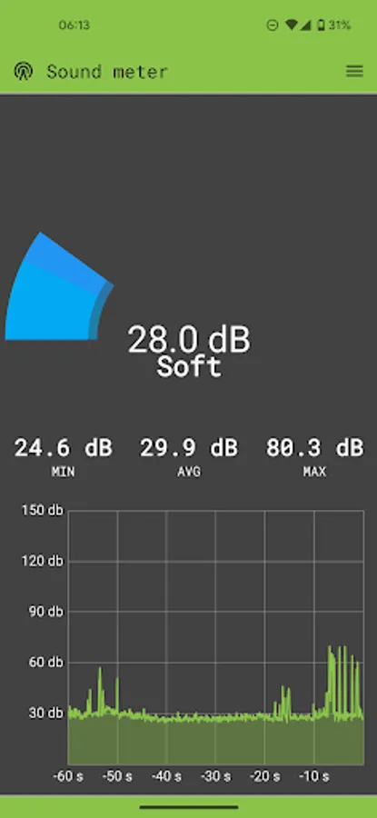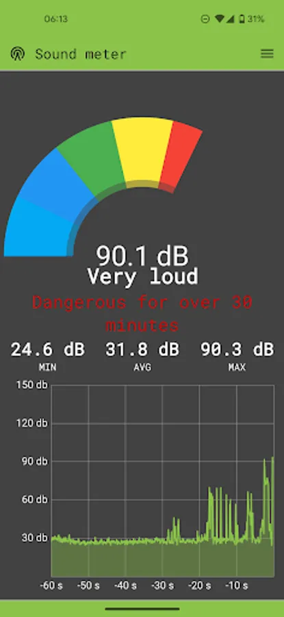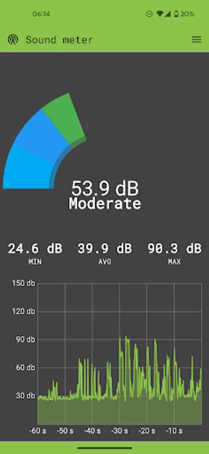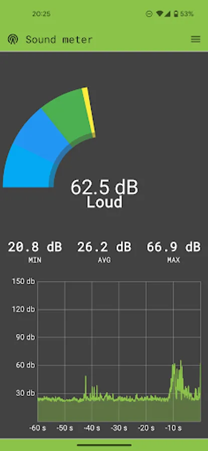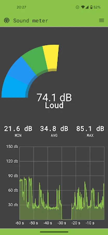 Sound meter is simple and easy-to-use sound level meter (or SPL) for your Android device. In it's user-friendly interface, it displays current noise levels around you. minimum/average/maximum decibel values, and warnings for high levels of noise. It also features graph with measured values for the last minute. Sound meter is an essential tools for those, who are curious about the sound levels around them.