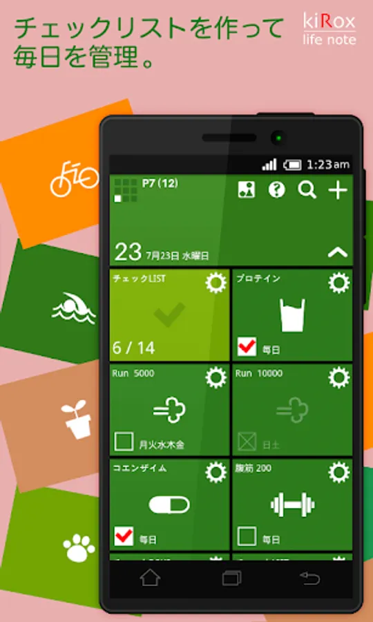 何を記録するかは100%お任せします。お好きなコンポーネント(コンポ)を配置してお使いください。コンポを自由にカスタマイズすれば、世界にたった1つのノートを作ることができます。そしてチェックリスト機能を使えば、毎日をさらに効果的に管理できます。生活に取り入れたいことをどんどん登録して、理想の毎日を実践してください。