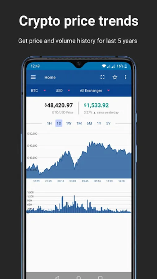 - Interactive Price Tracking: Access real-time charts with price and volume data for 1500+ coins, customizable by day, month, and year. Visualize market trends and make informed decisions.