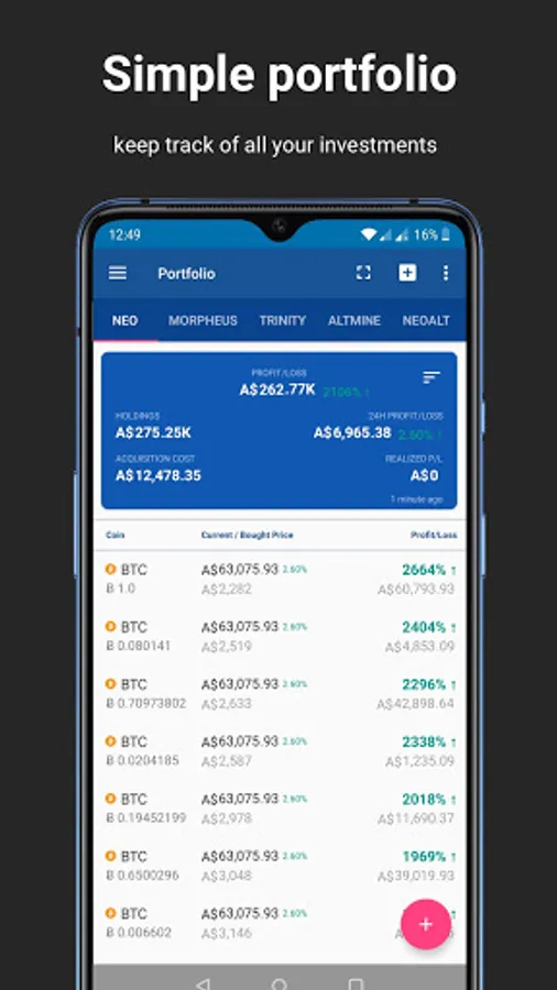 - Portfolio Management: Easily manage your entire portfolio and track profit/loss within the last 24 hours. Use this feature to identify new trading opportunities based on real-time prices.
