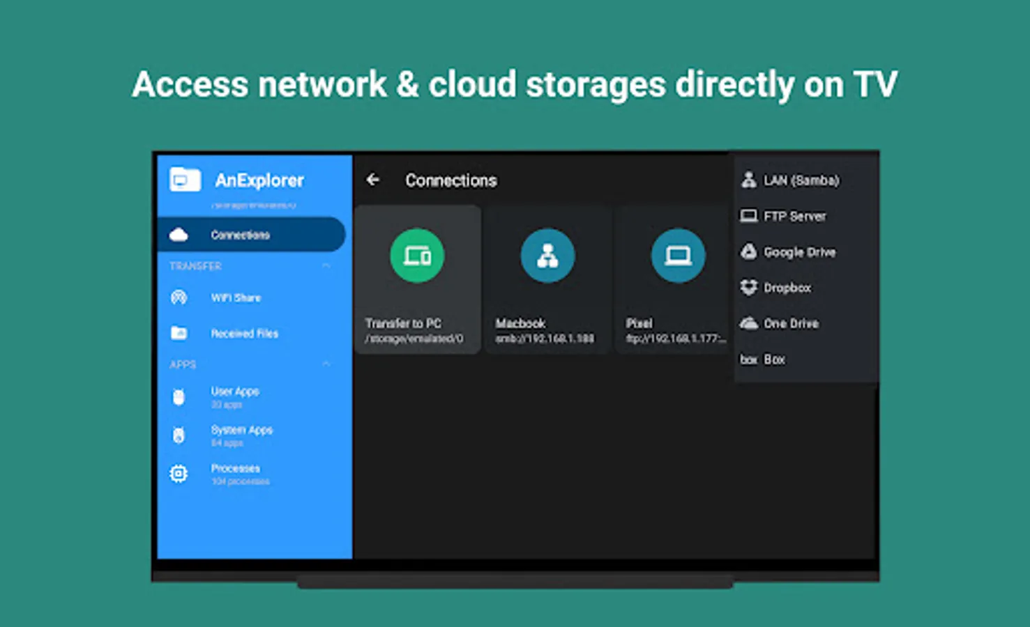 - Transfer files effortlessly between internal storage, USB devices, SD cards, network storage, and cloud services