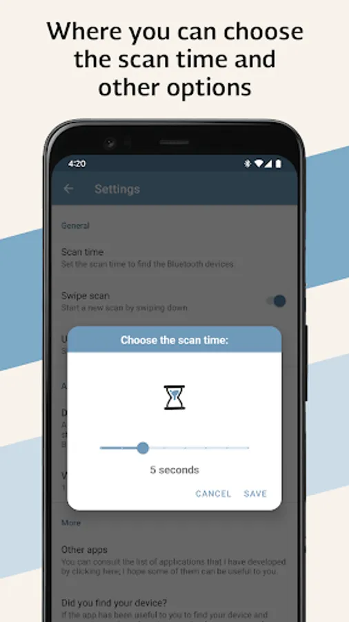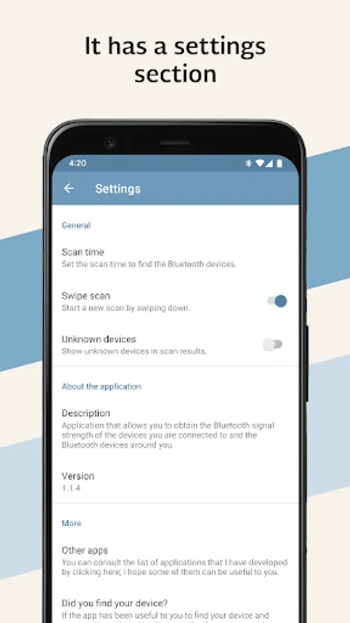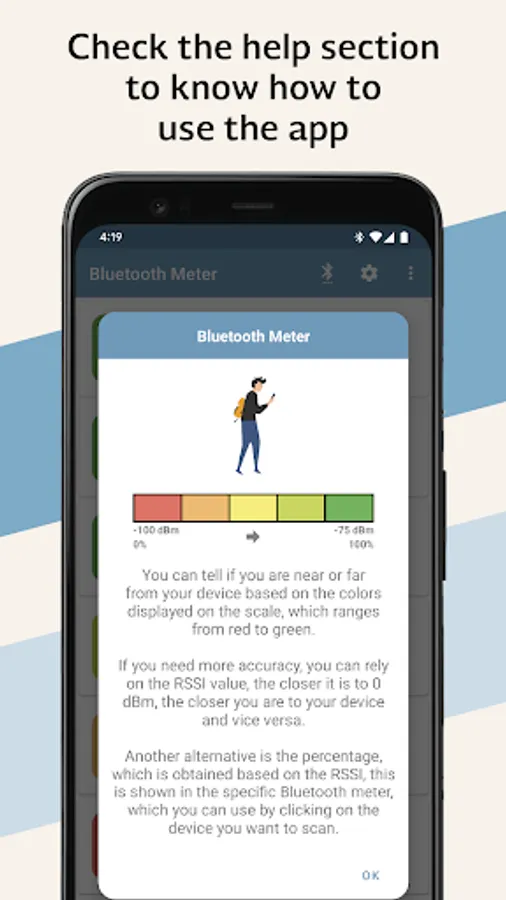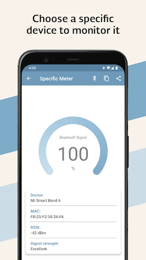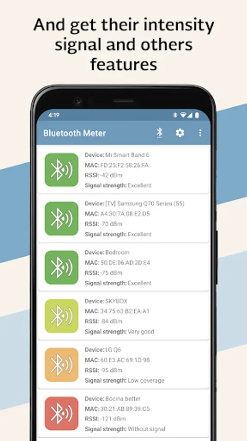 Get the Bluetooth signal strength of the devices you are connected to and the Bluetooth devices around you. This is useful for finding the best place to connect to them, or also for finding your Bluetooth devices in case you've lost them, as long as they're still turned on and visible. In addition to the Bluetooth signal strength, other relevant characteristics can be observed, such as the name, the MAC address, etc.