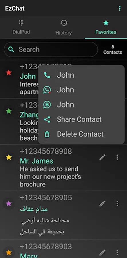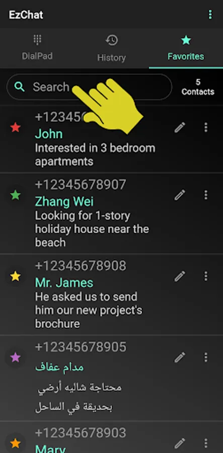 Moreover, with EzChat you can save all your "Business/non-personal" contacts in one secure database, eliminating the need to clutter your personal mobile contact list. Plus, you can easily find any contact within seconds with the option to categorize and search using keywords.