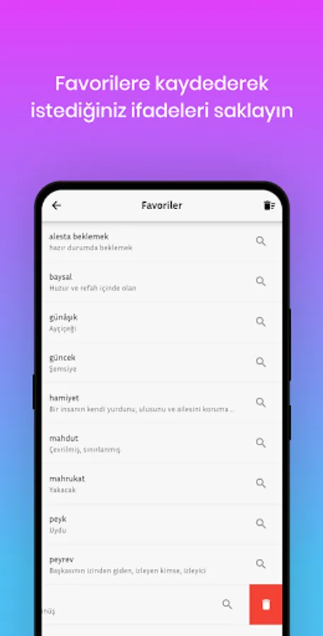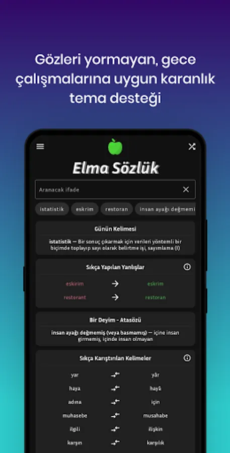 Search for the phrase you want, get instant suggestions as soon as you start typing and results uploaded within milliseconds. Save the word in your favorites or share it with your friends, with all its meanings and attributes. With its dark theme option, it is also suitable for work that lasts all night. You can continue reading for other features of Elma Sözlük, which will provide you with the most up-to-date Turkish dictionary experience with its modern interface!