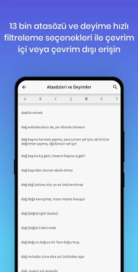 13 thousand proverbs and idioms are waiting for you, which are also available offline. You can search the huge list flexibly and see the meaning of the relevant content with a single tap on the result.