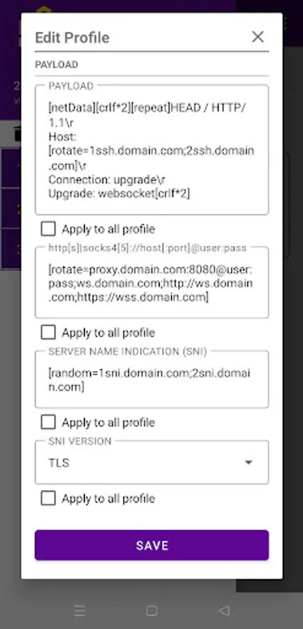 - not support combine normal sni and custom payload/ws/wss in one profile, because sni must empty payload